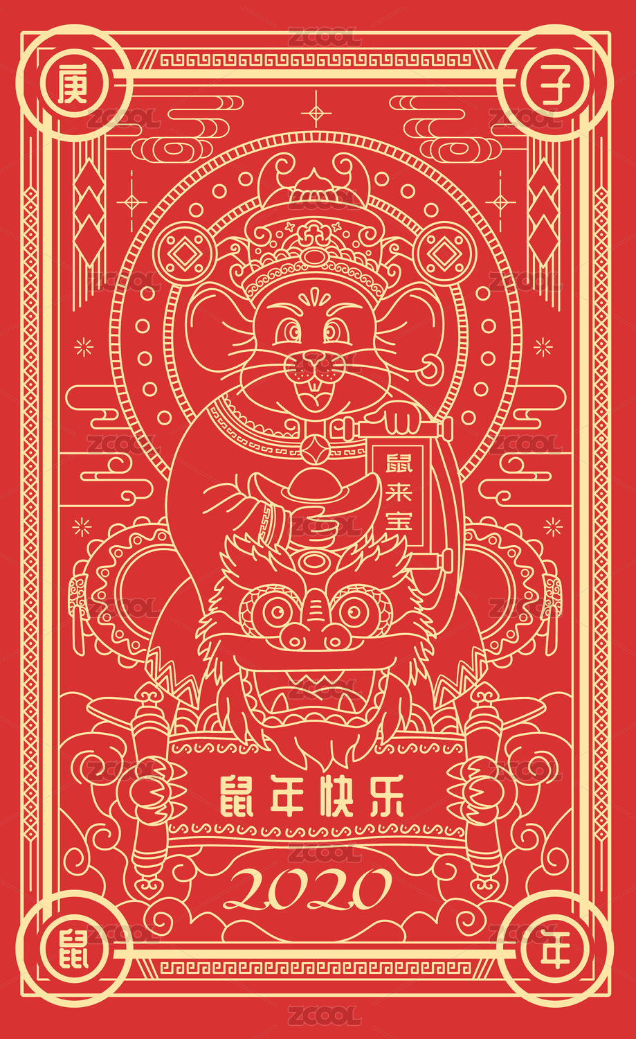 2020年老鼠裝扮財神騎著舞獅拜年描邊金矢量插畫