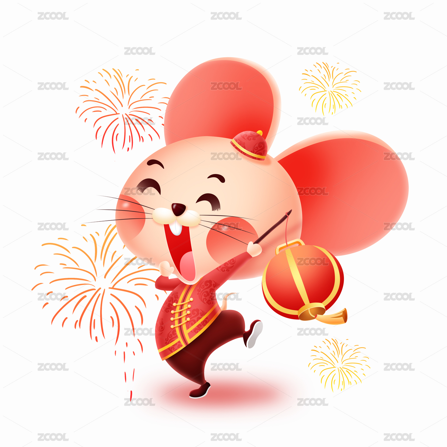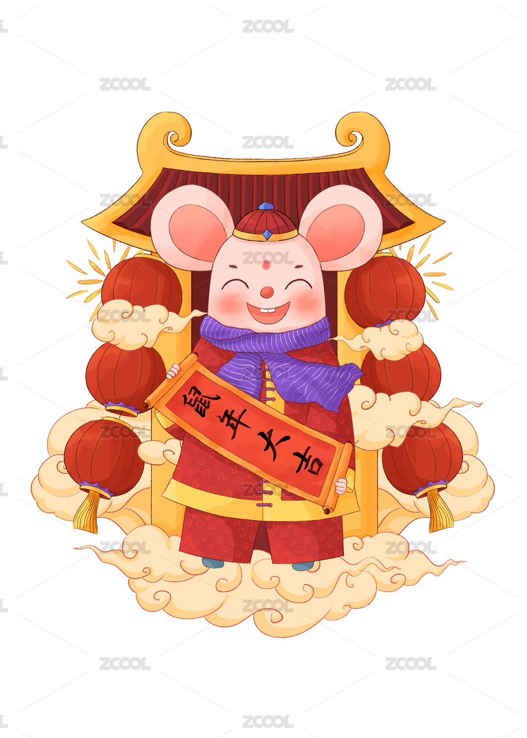 燈籠祥云前手拿對聯(lián)的可愛戴帽子老鼠的喜慶鼠年插畫白底