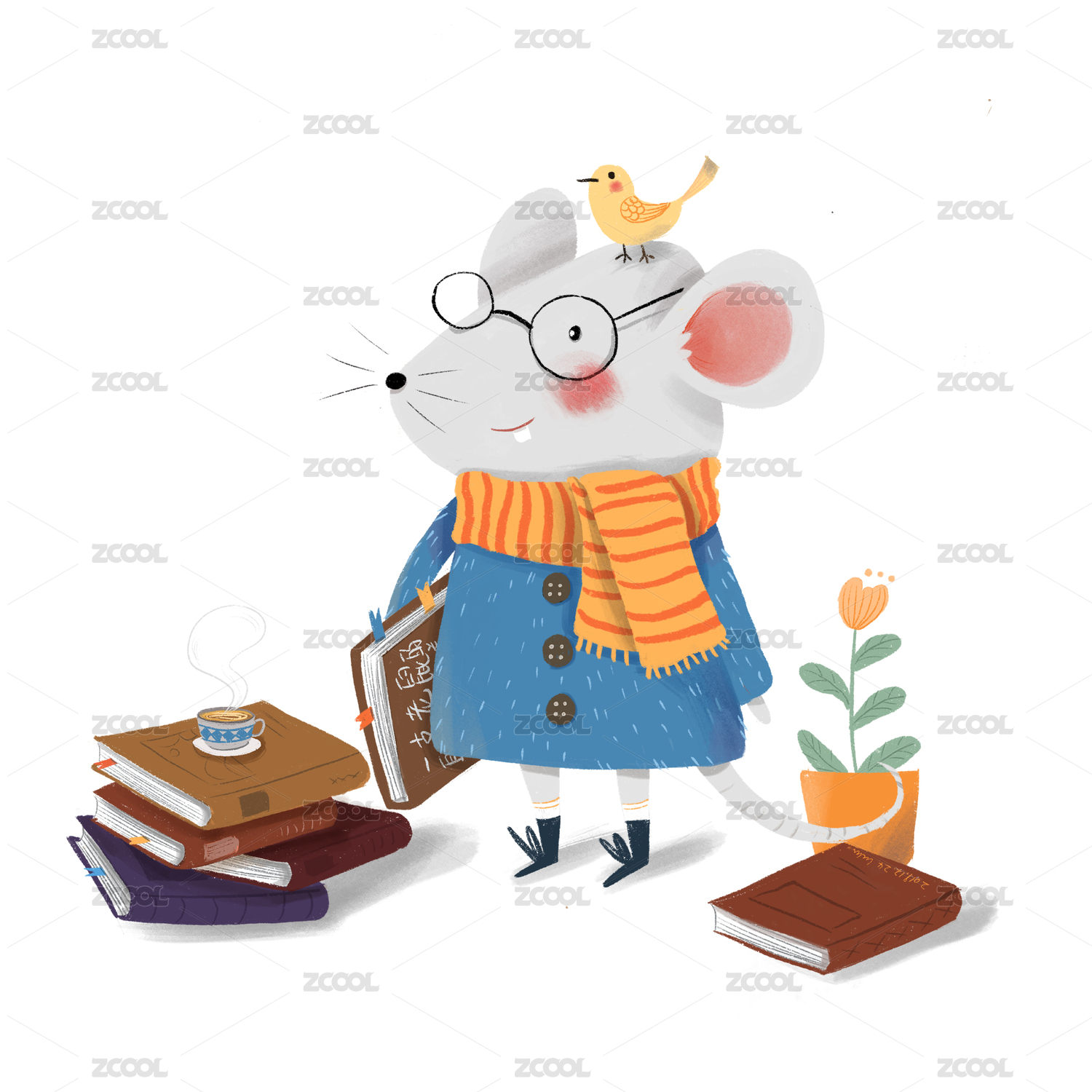 一只戴眼鏡頭上小鳥喜歡看書穿著藍色衣服黃色圍巾的老鼠