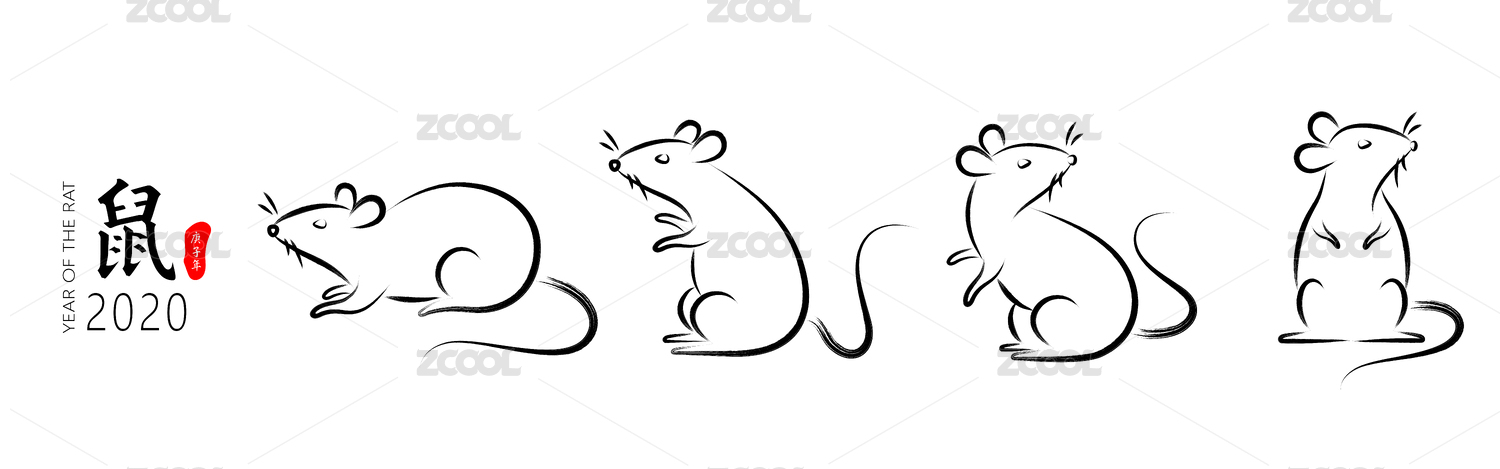 手繪書法風格的老鼠插畫,2020年鼠年,十二生肖-鼠