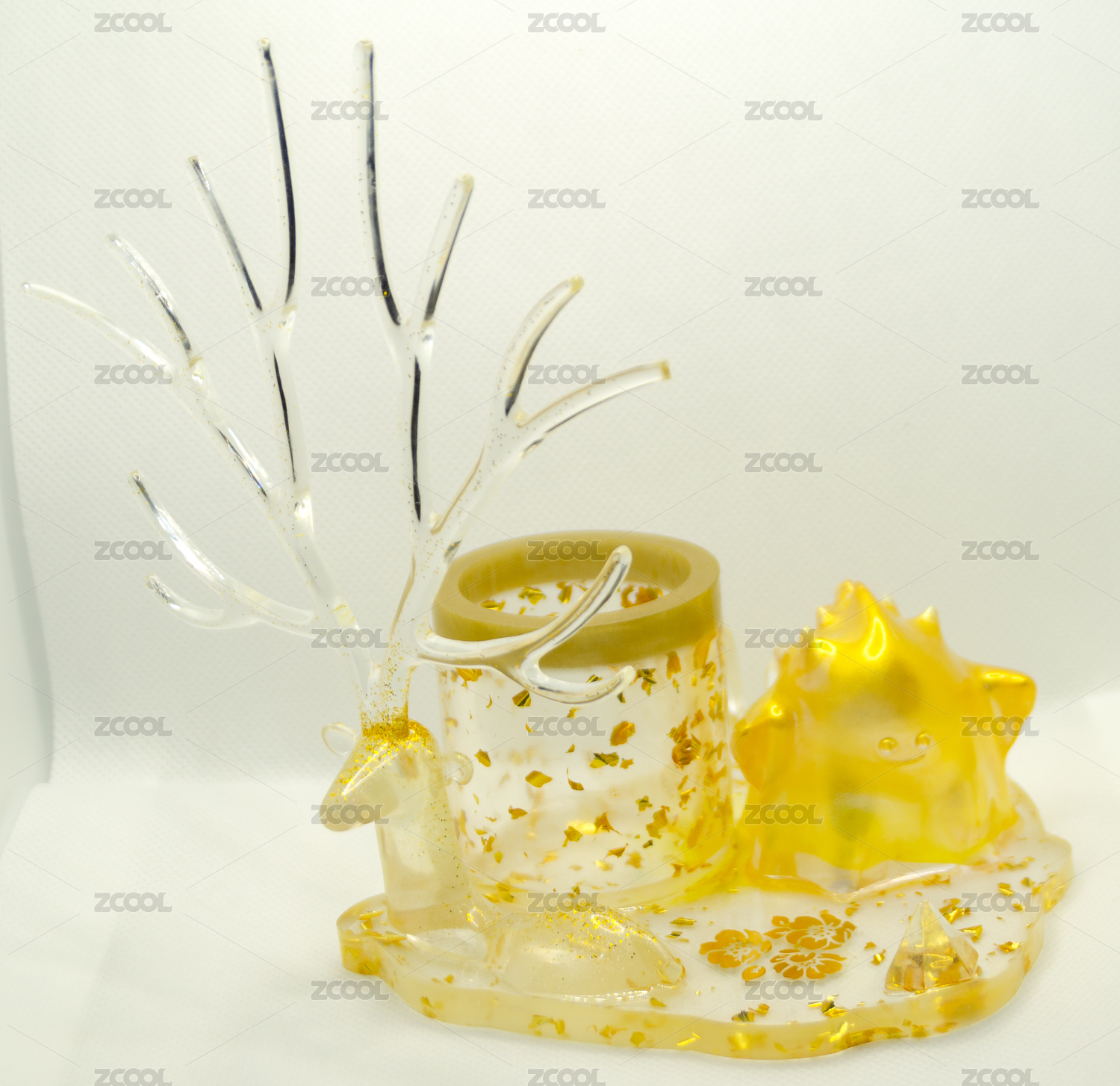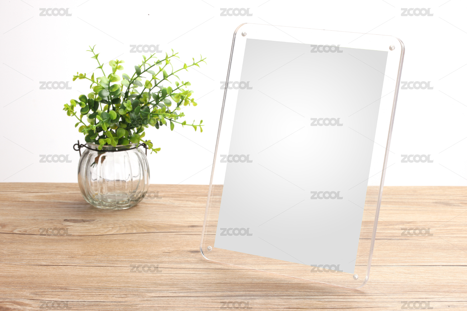 木質(zhì)桌面上擺放的一個亞克力相框擺臺及一盆綠植