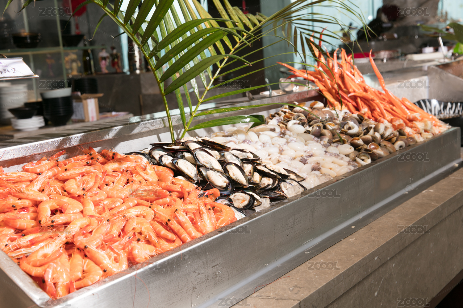 不銹鋼擺臺冰上各種蝦貽貝烏賊玉螺蟹腳海鮮