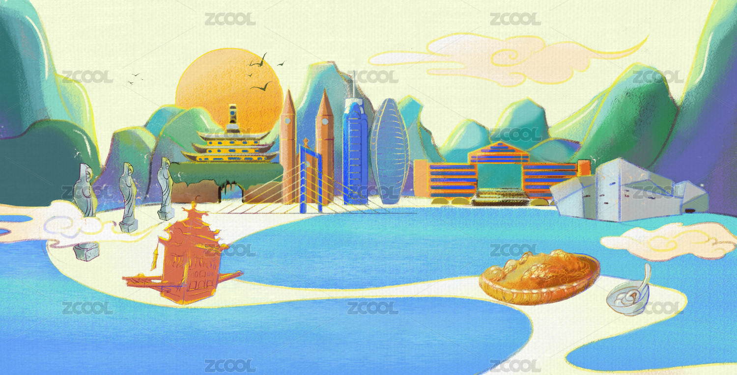 國風(fēng)寧波甬城城市建筑橫向插畫黃色調(diào)