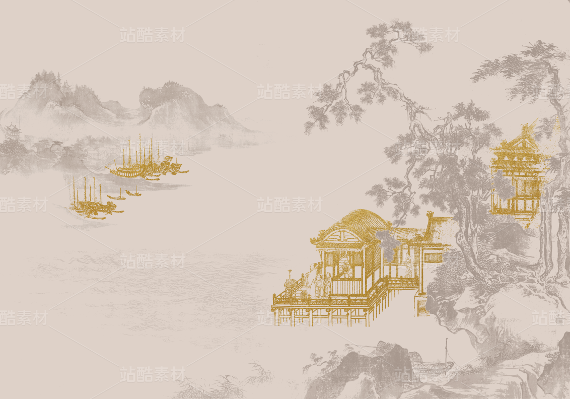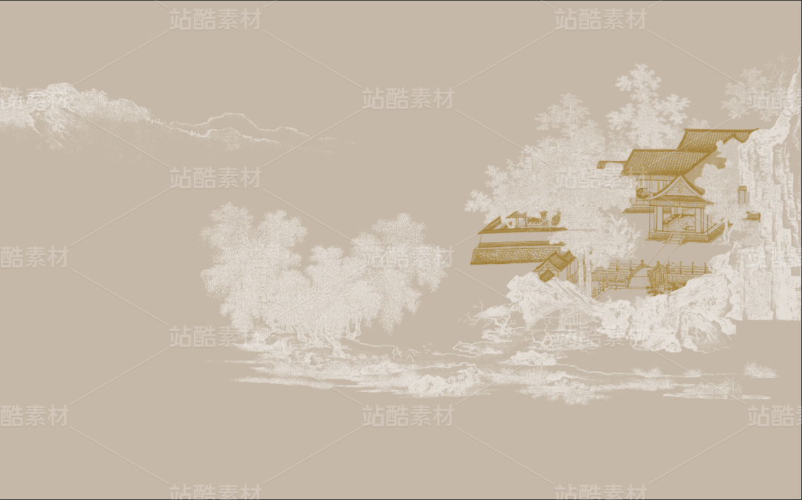 新中式手繪線描山水閣樓背景墻