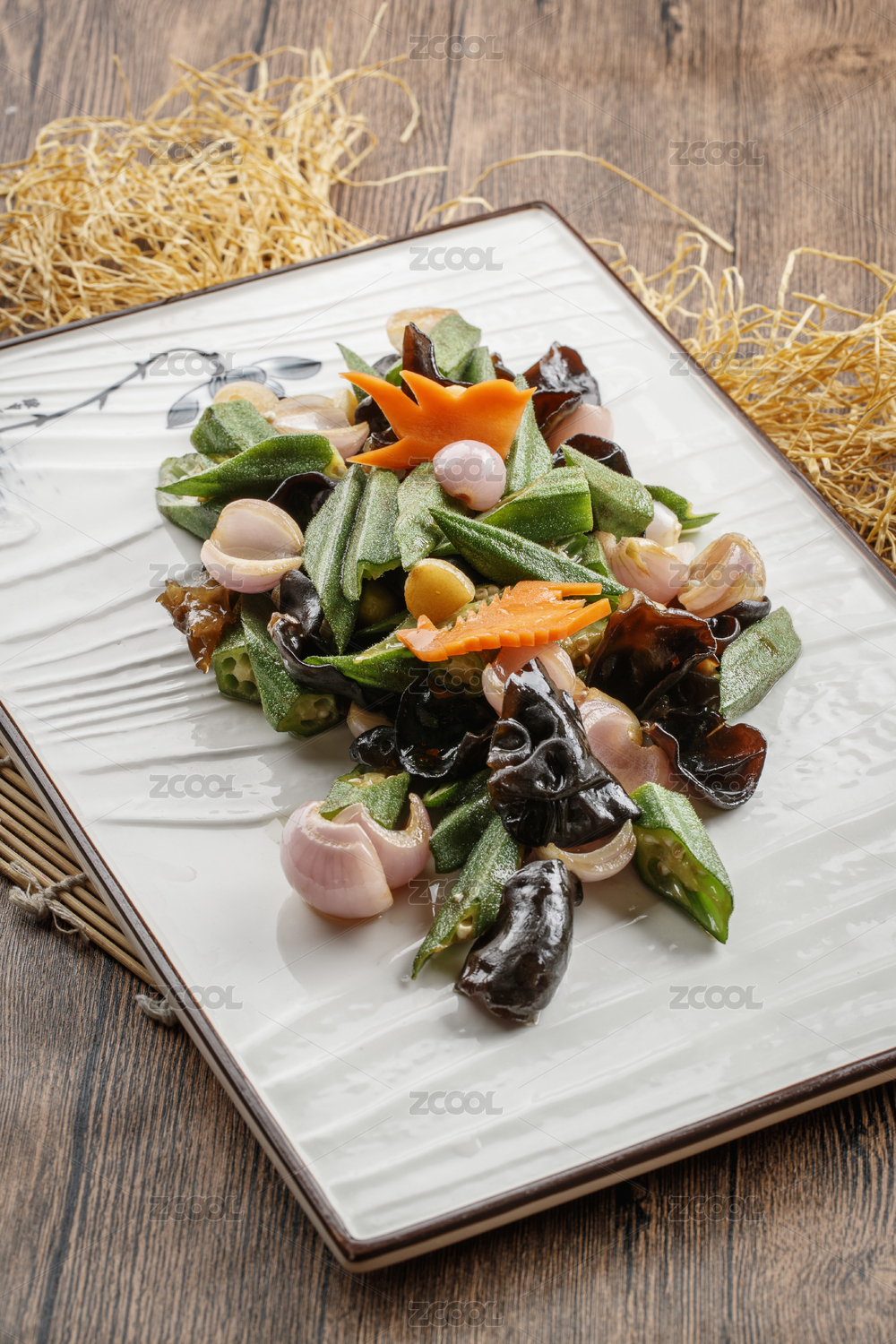 木質(zhì)底紋上的長瓷盤裝的木耳洋蔥炒秋葵