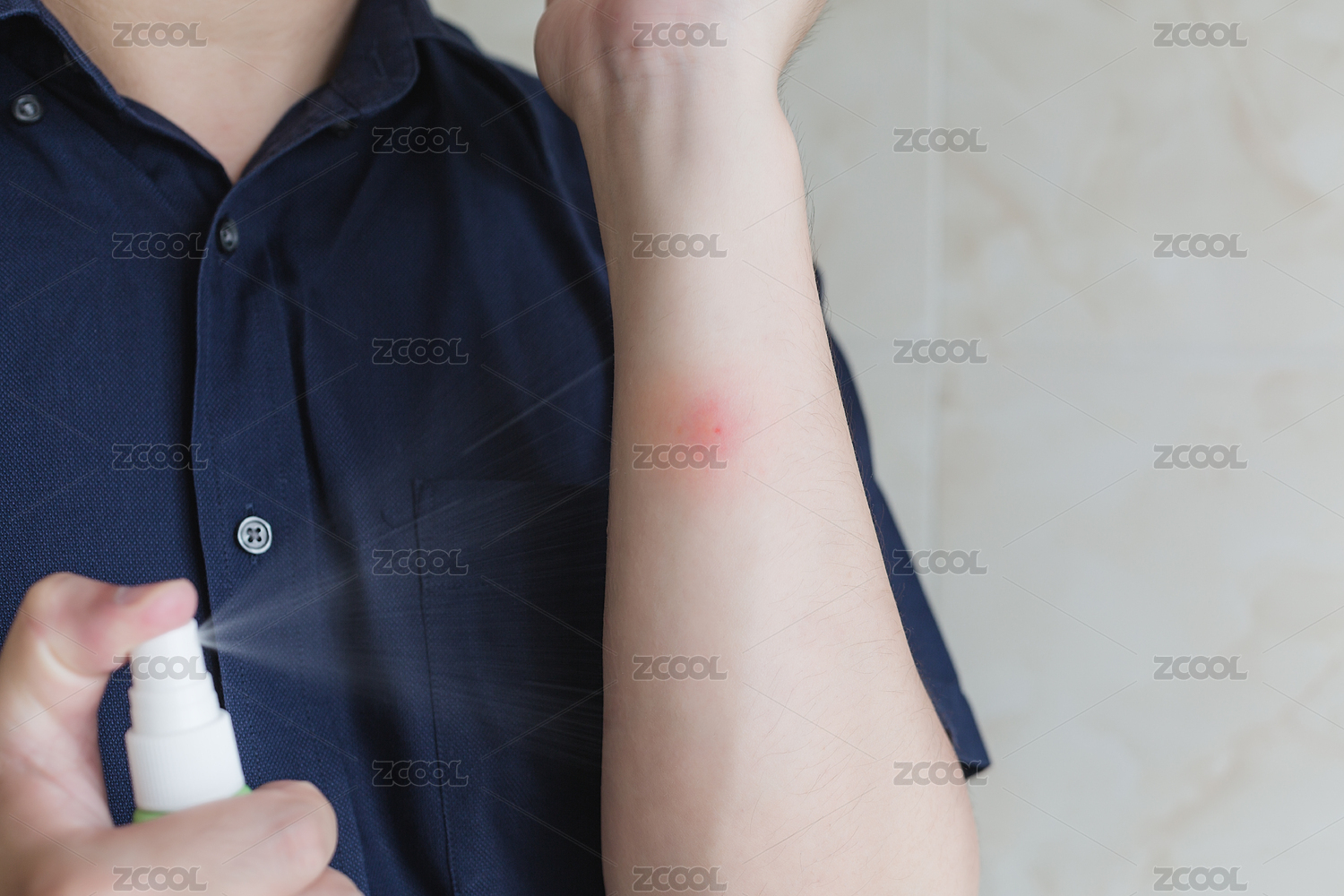 給手臂蚊蟲叮咬的紅包噴藥治療。