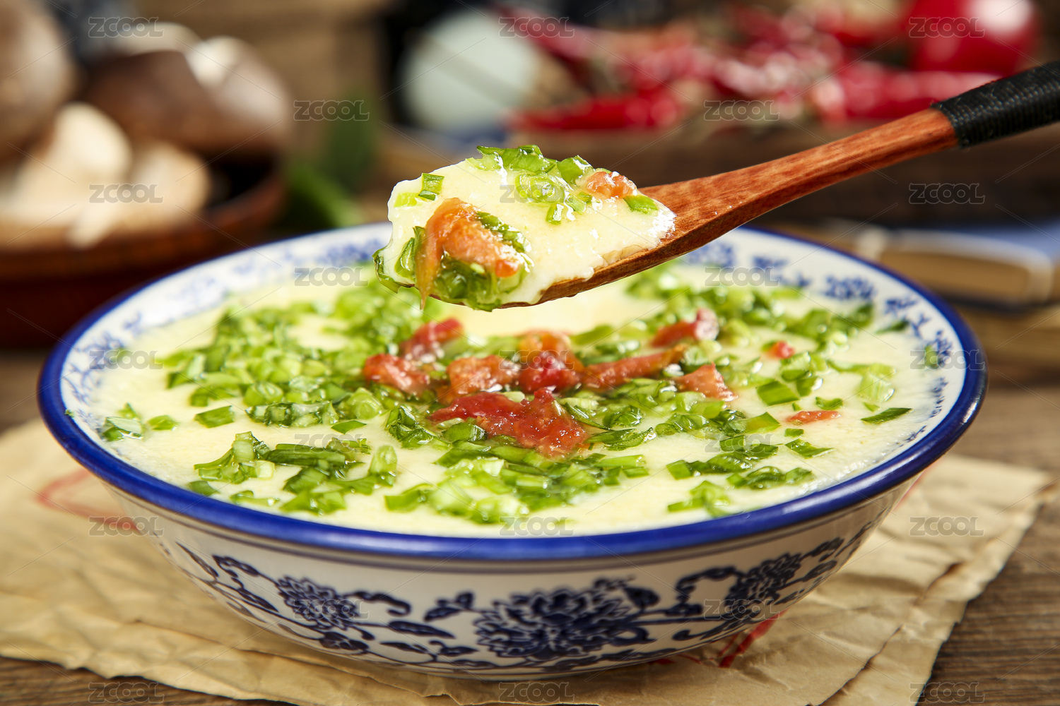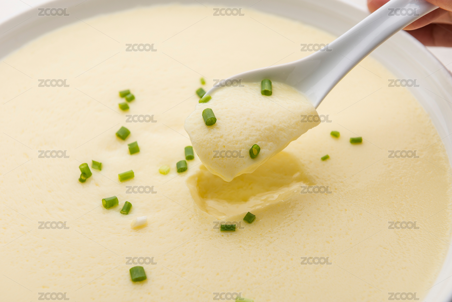 深底上放著一碗香蔥雞蛋羹和勺子上挖著雞蛋