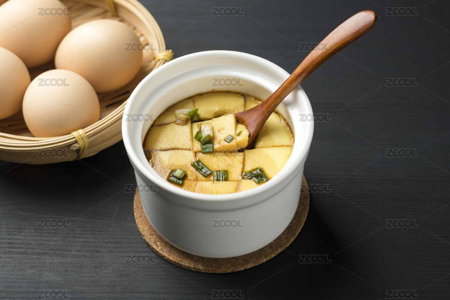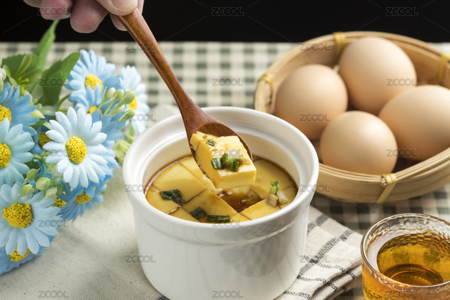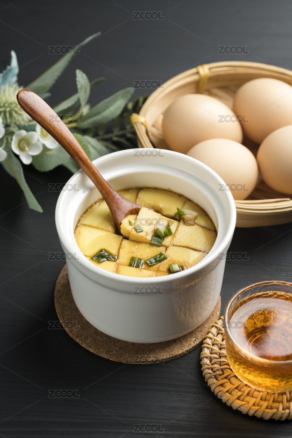 桌上碗里的雞蛋羹高角度視圖