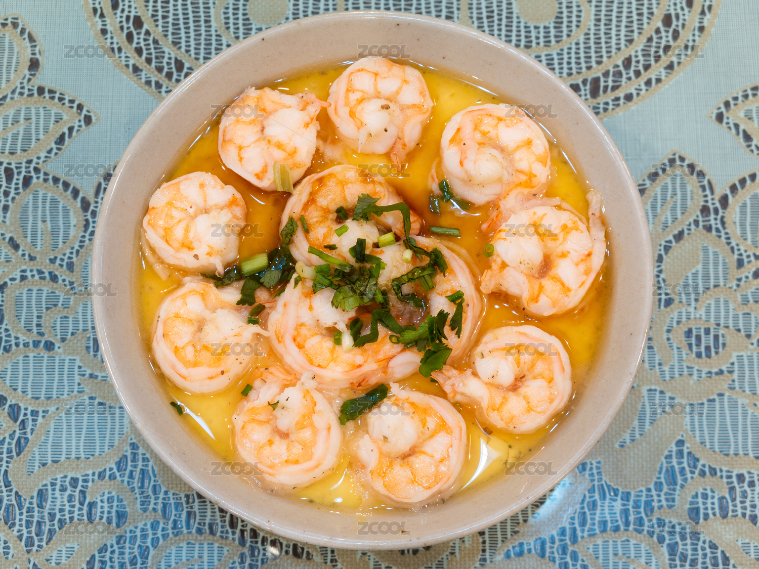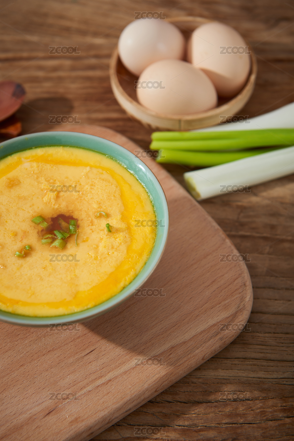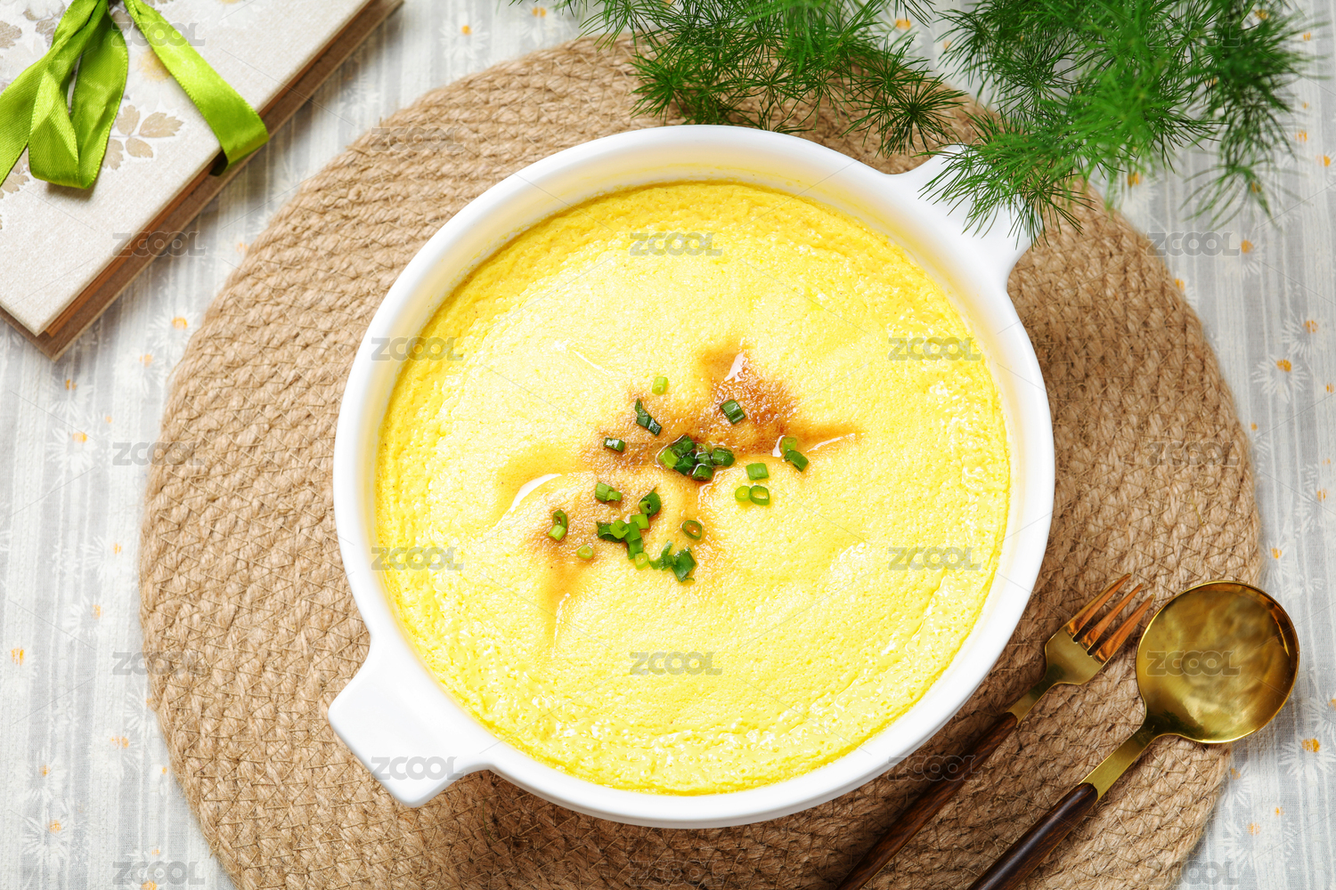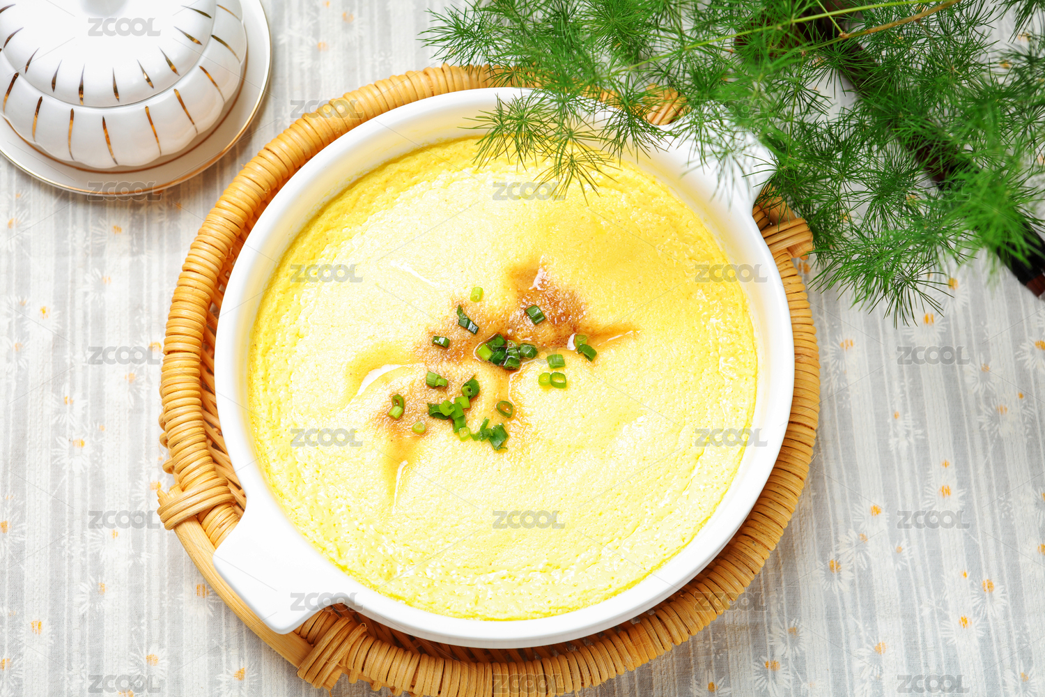 桌上碗里的雞蛋羹高角度視圖