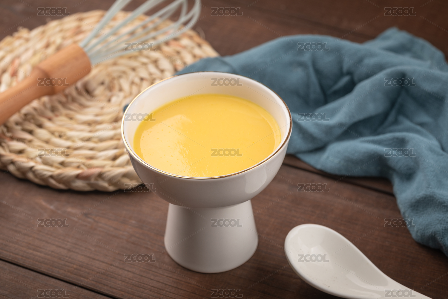 一碗雞蛋羹擺放在桌面上特寫