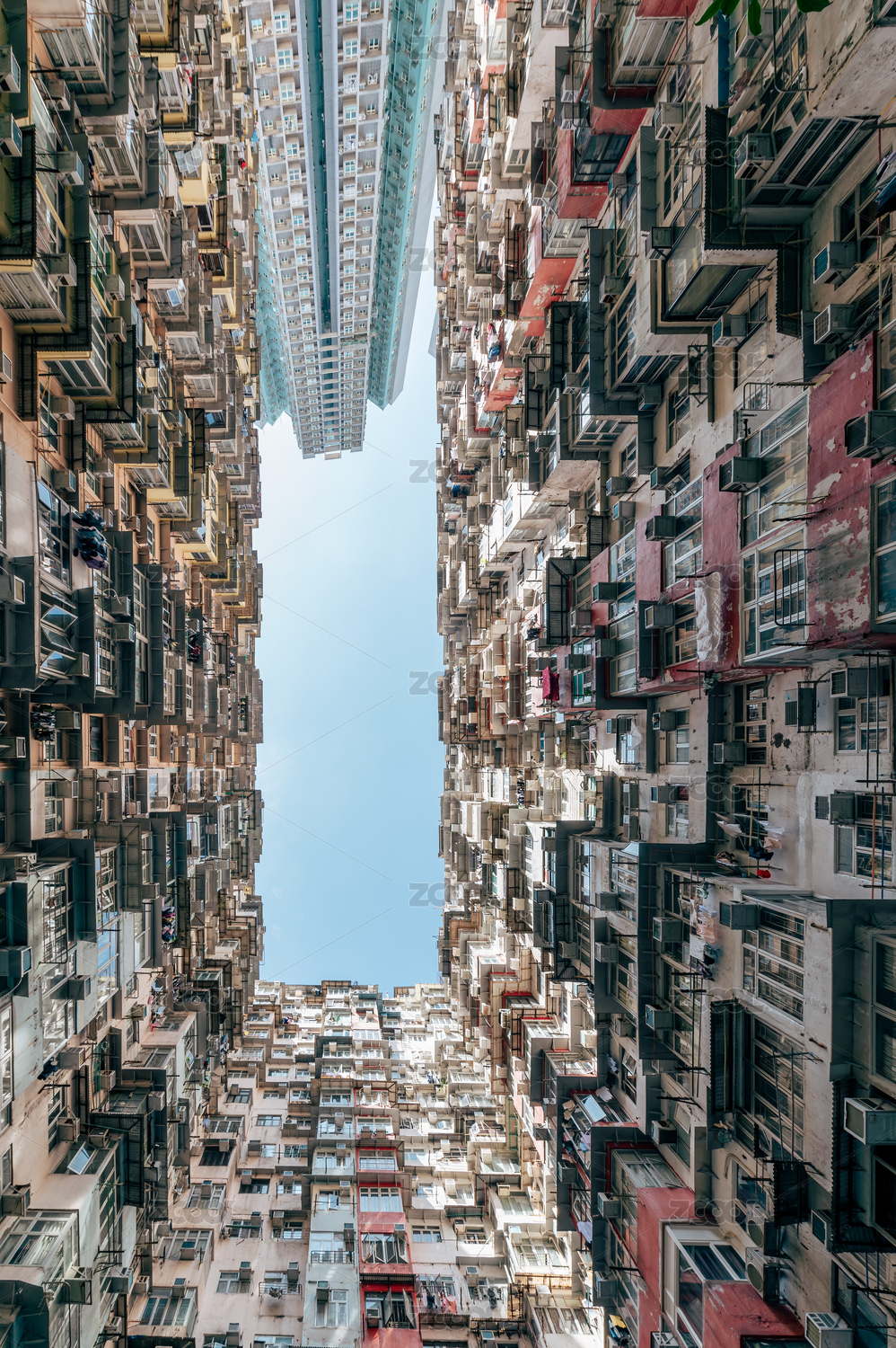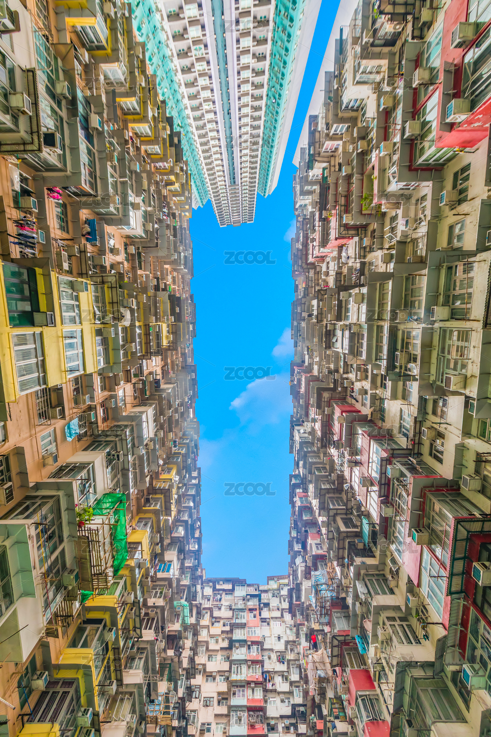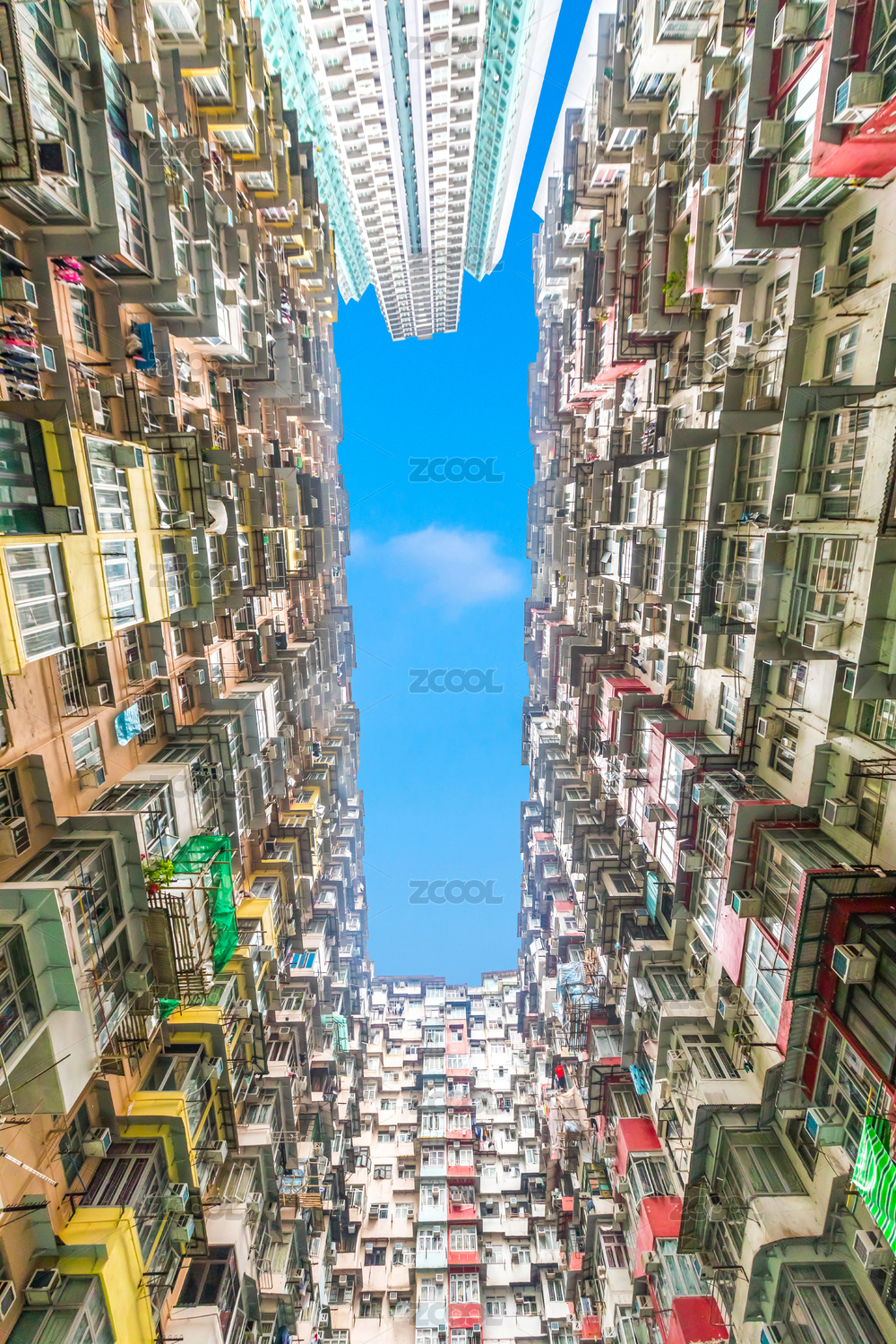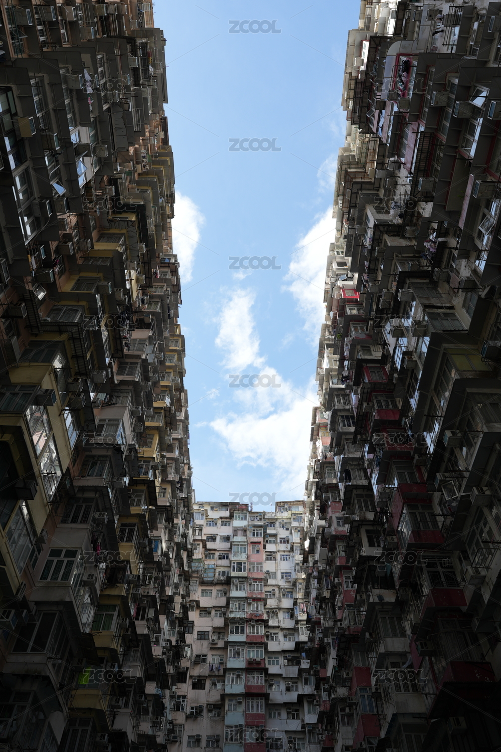 中國(guó)香港仰拍怪獸大廈密集居民區(qū)