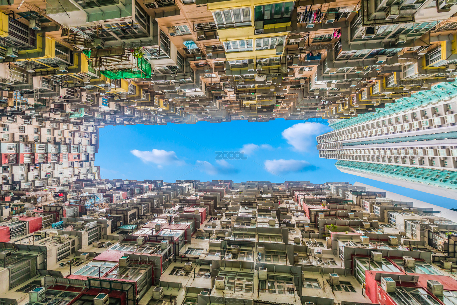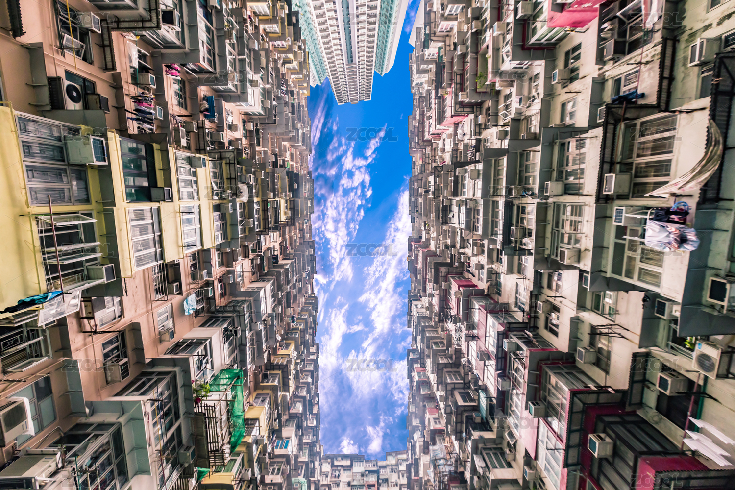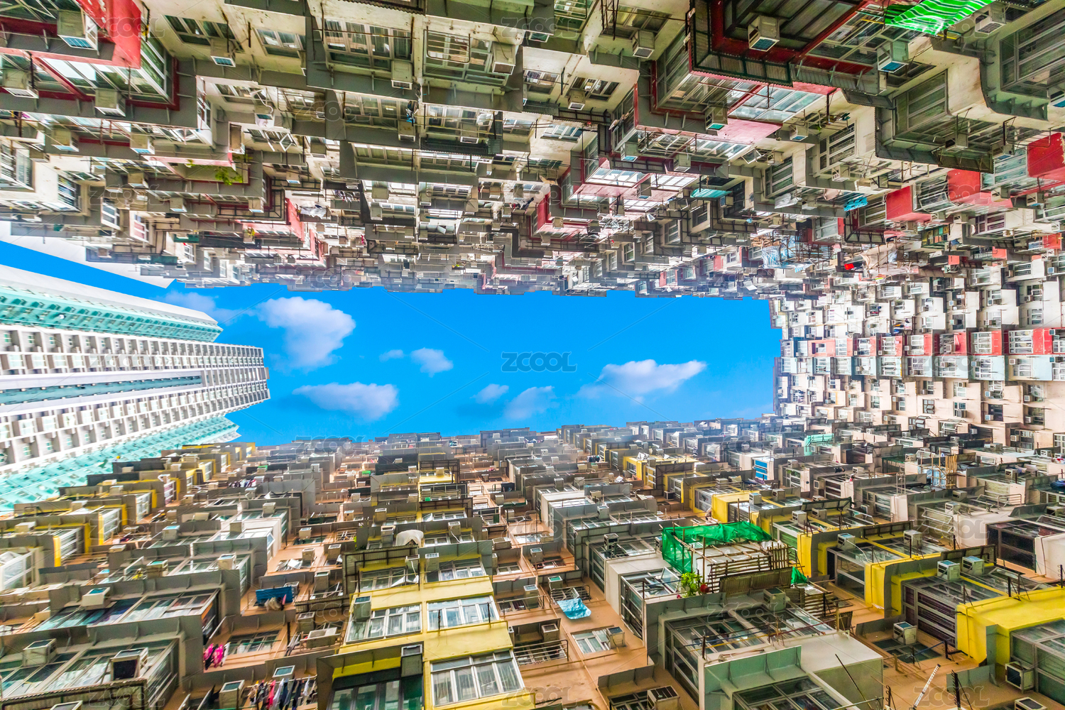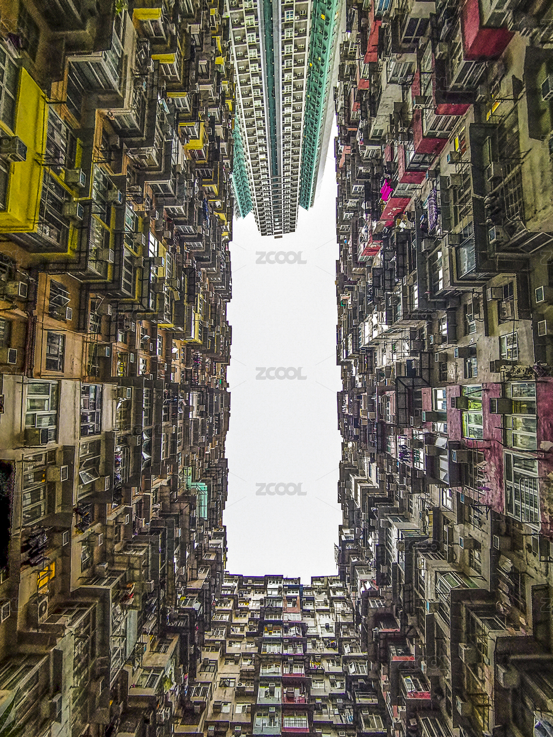 中國(guó)香港仰拍怪獸大廈密集居民區(qū)