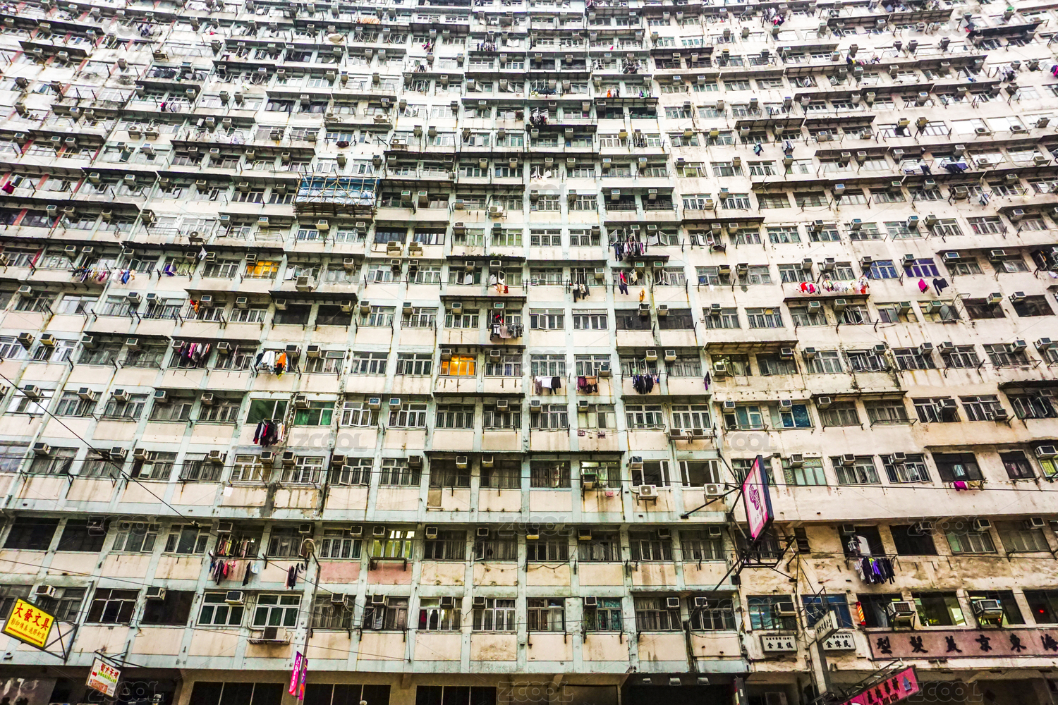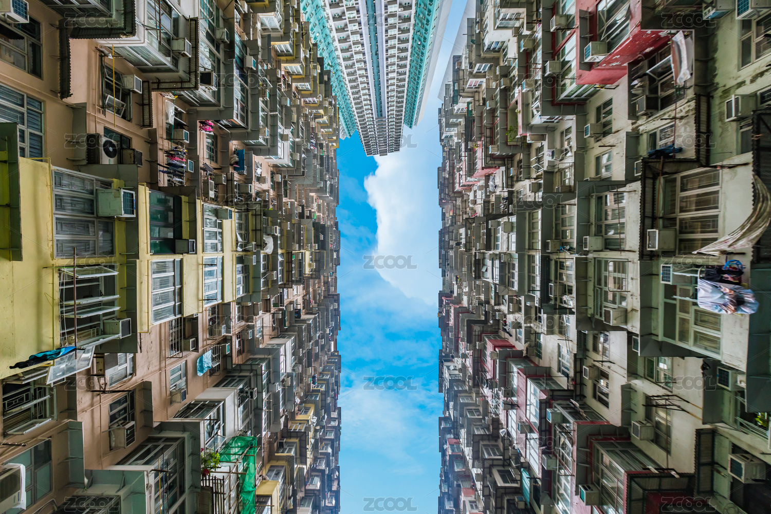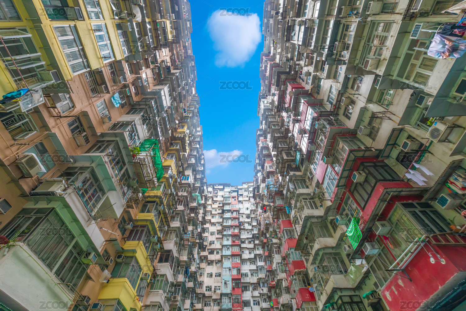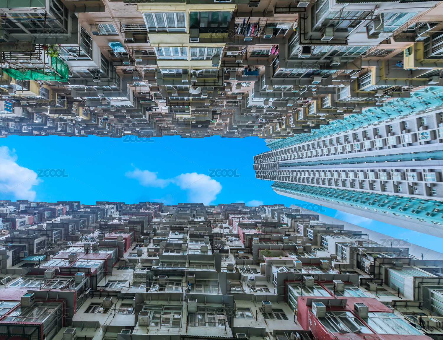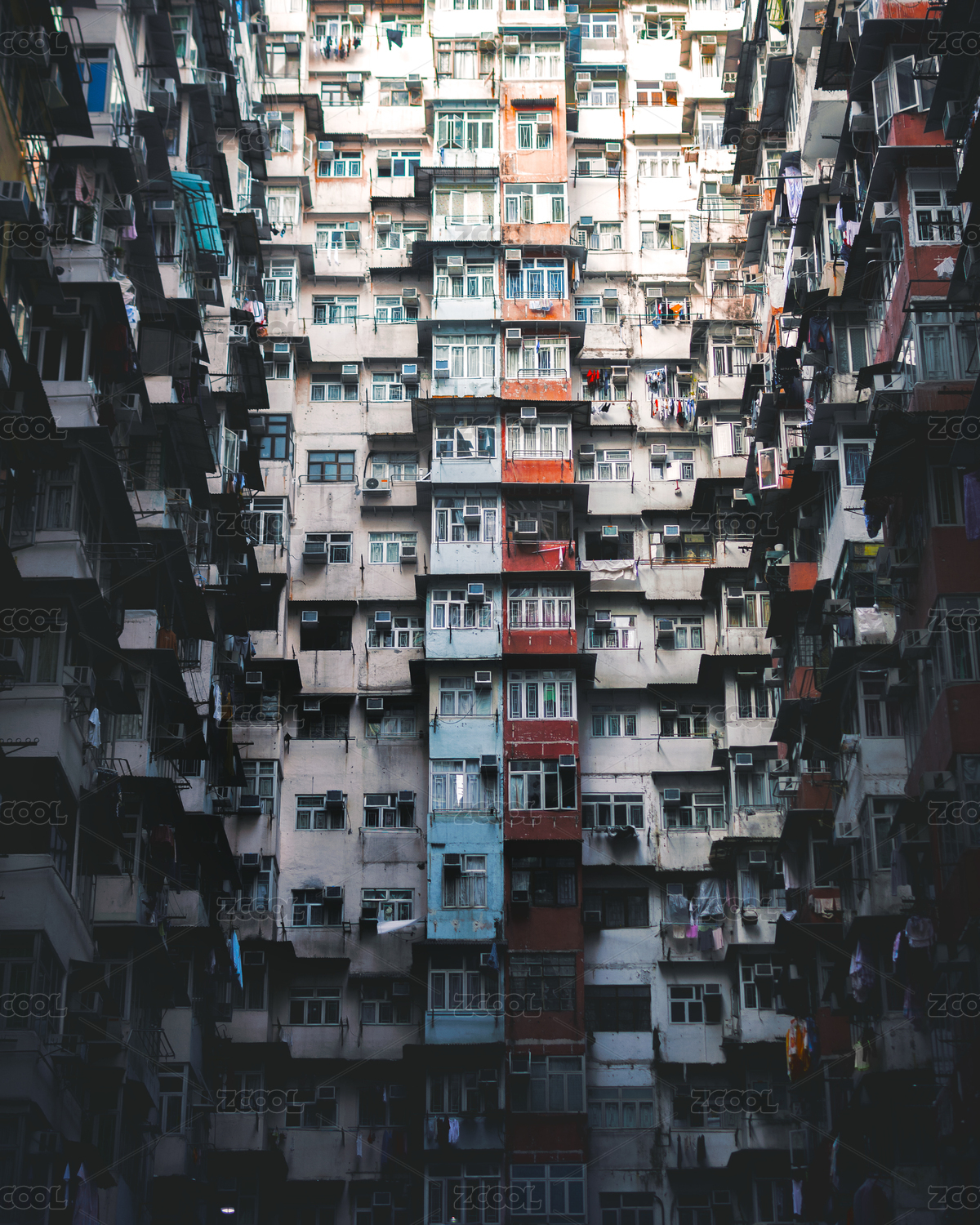中國(guó)香港仰拍怪獸大廈密集居民區(qū)