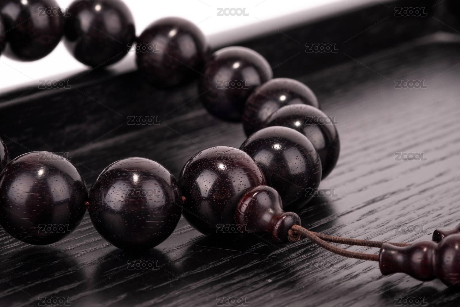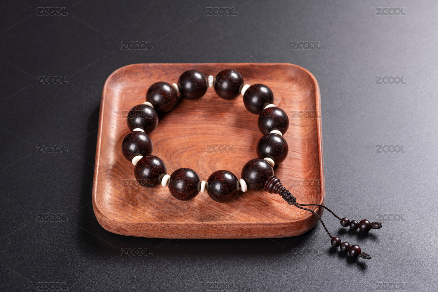 包漿濃厚的小葉紫檀佛珠手串?dāng)[放在木方盤中