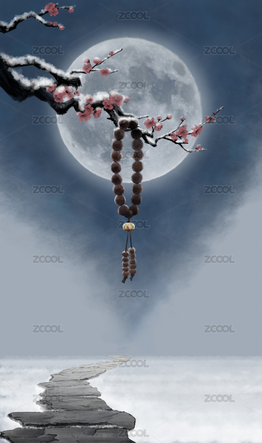 雪后掛在梅花枝條上的佛珠手串月影小徑圖
