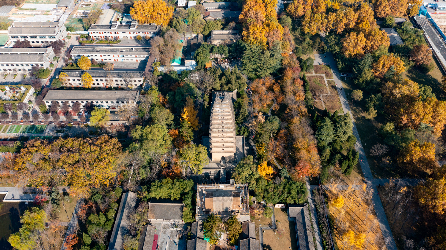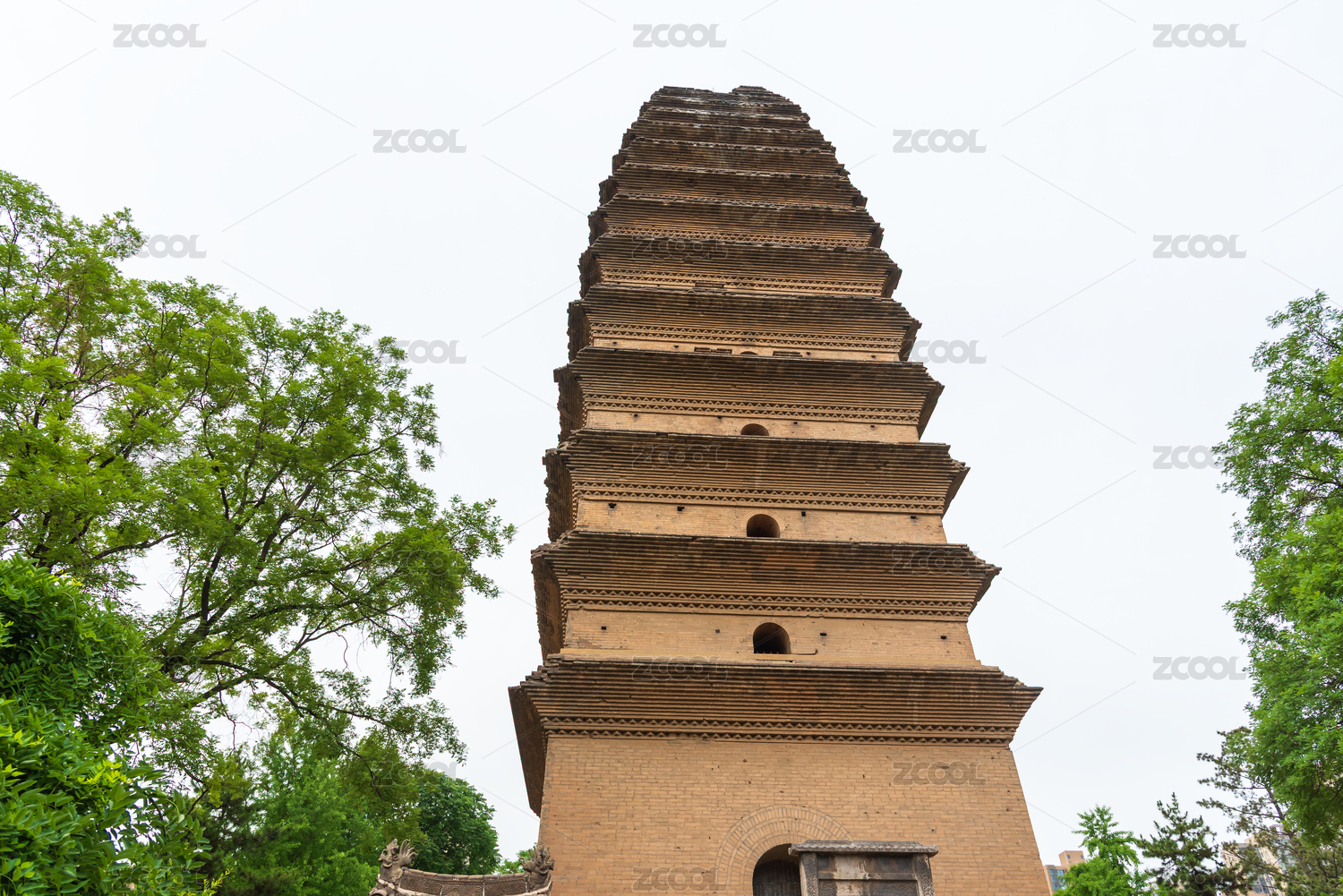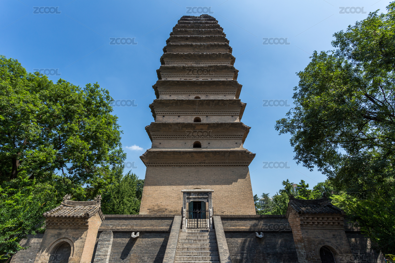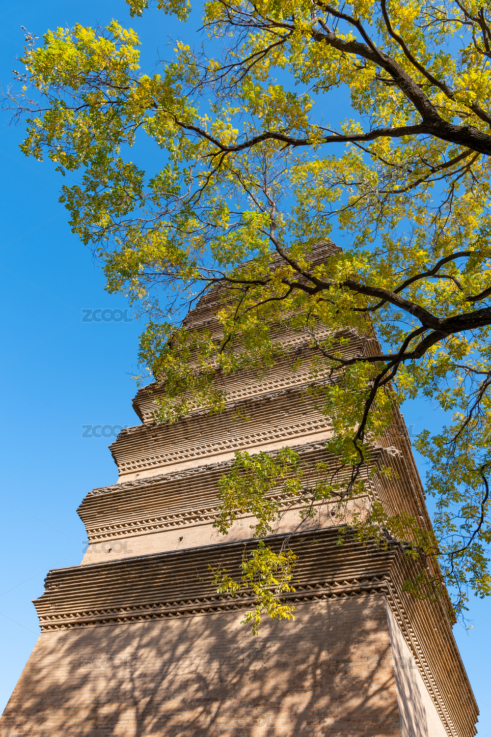 西安小雁塔遺址公園古老的小雁塔與參天古樹