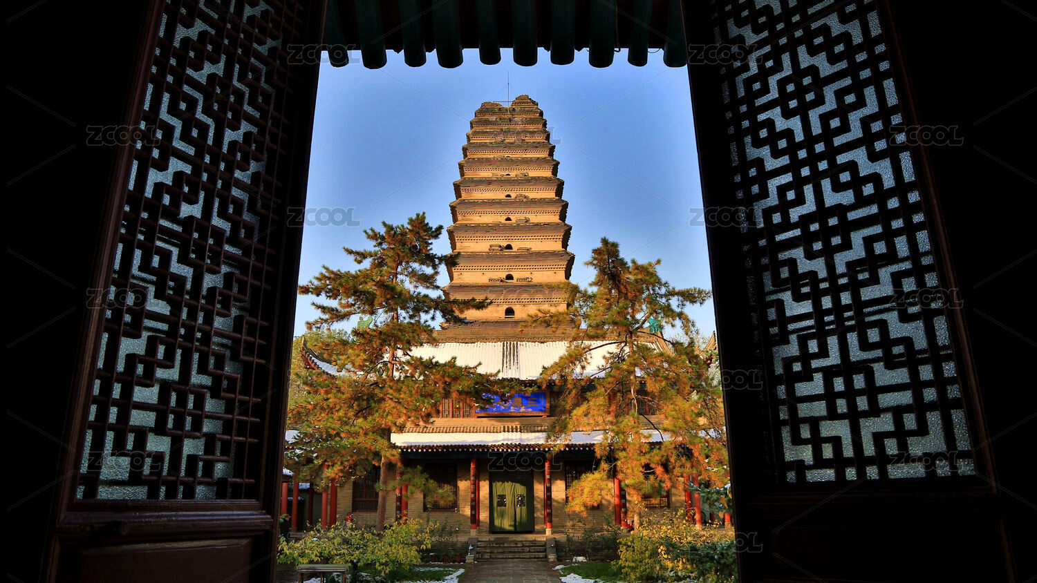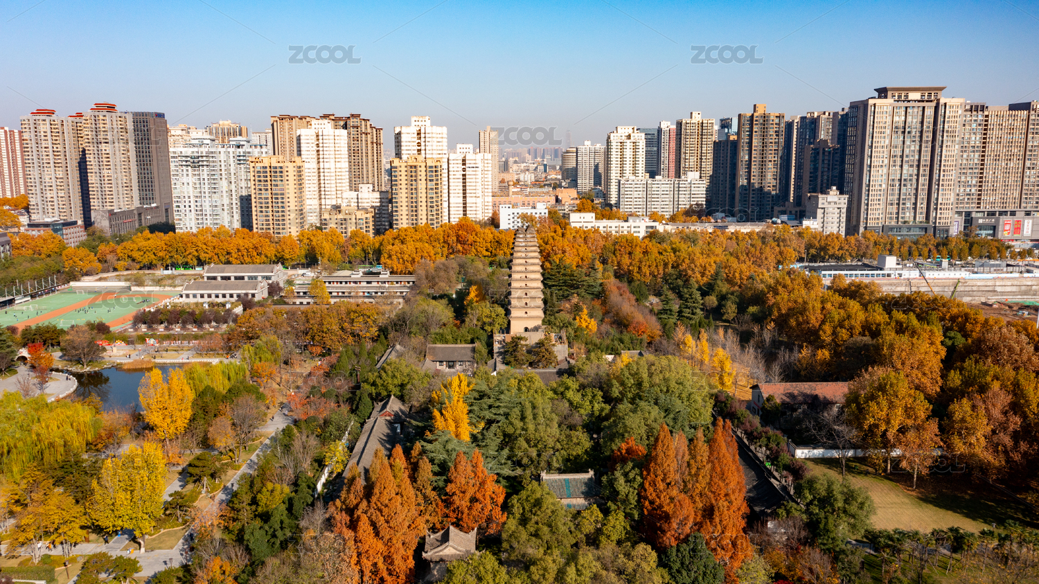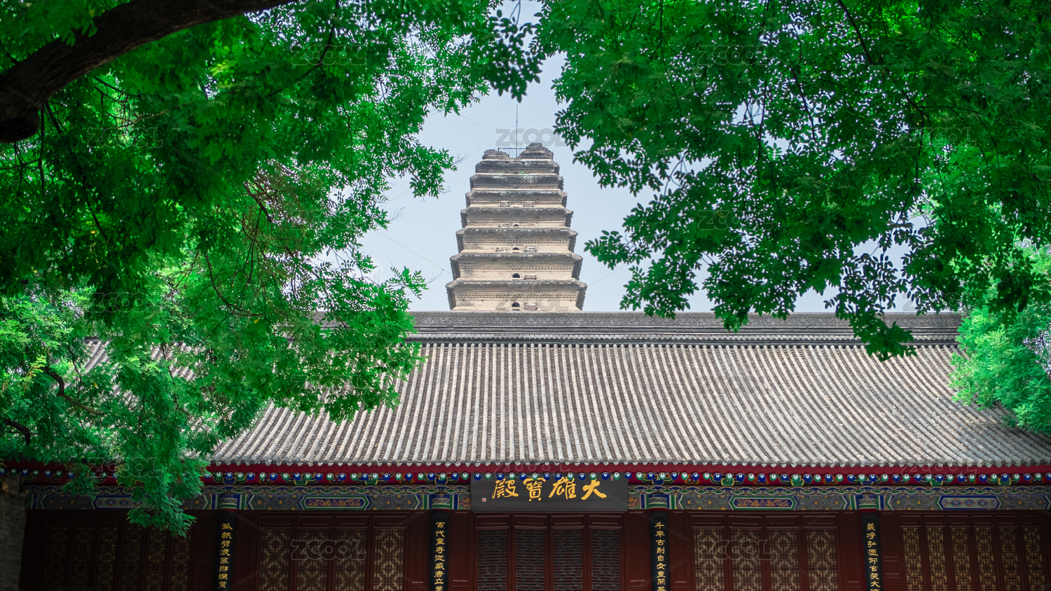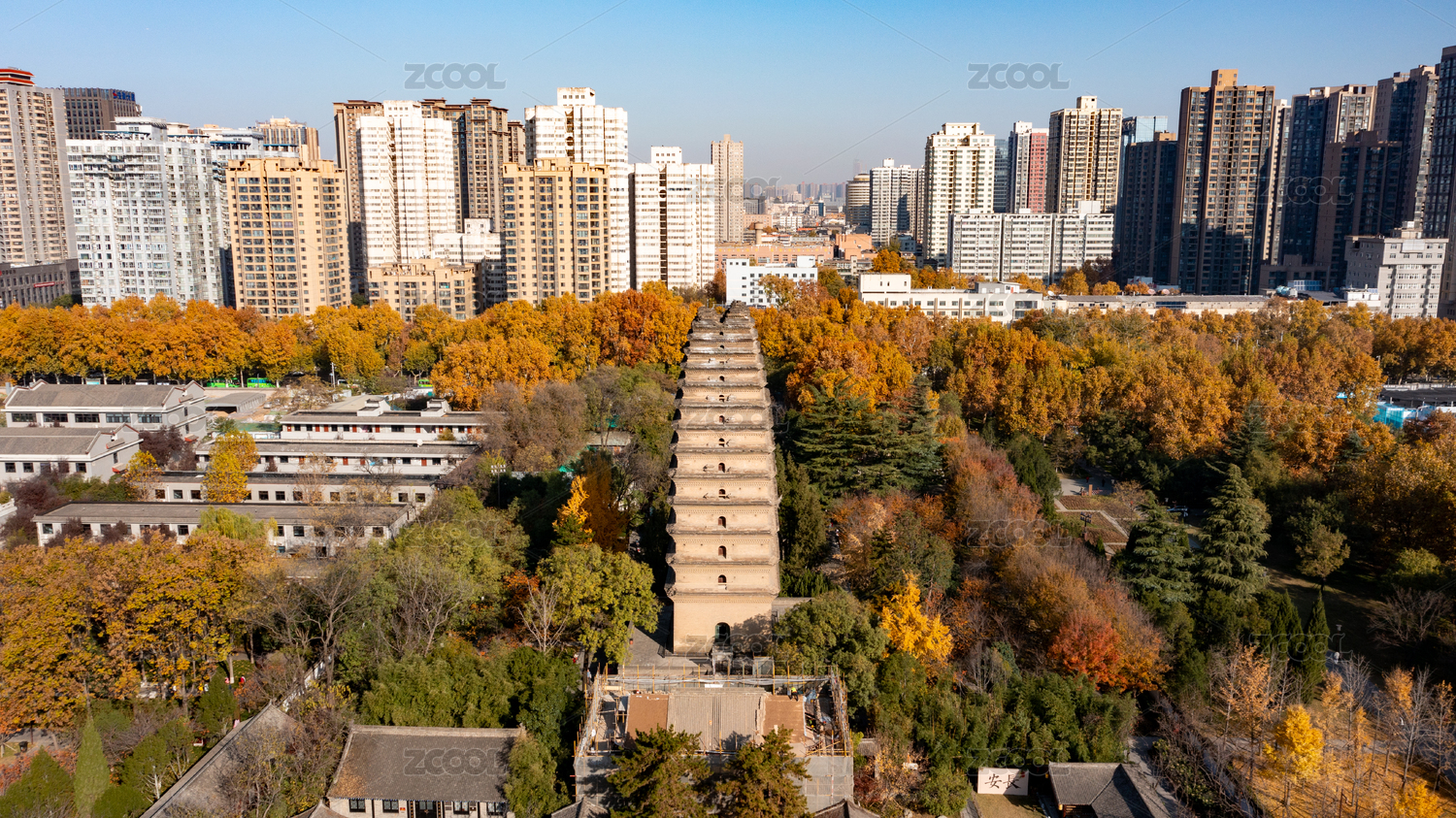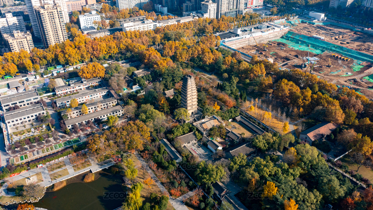 西安小雁塔遺址公園古老的小雁塔與參天古樹