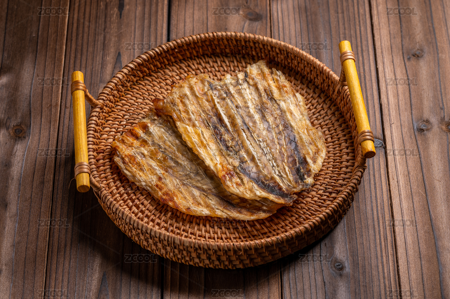 木紋桌上的烤魚片