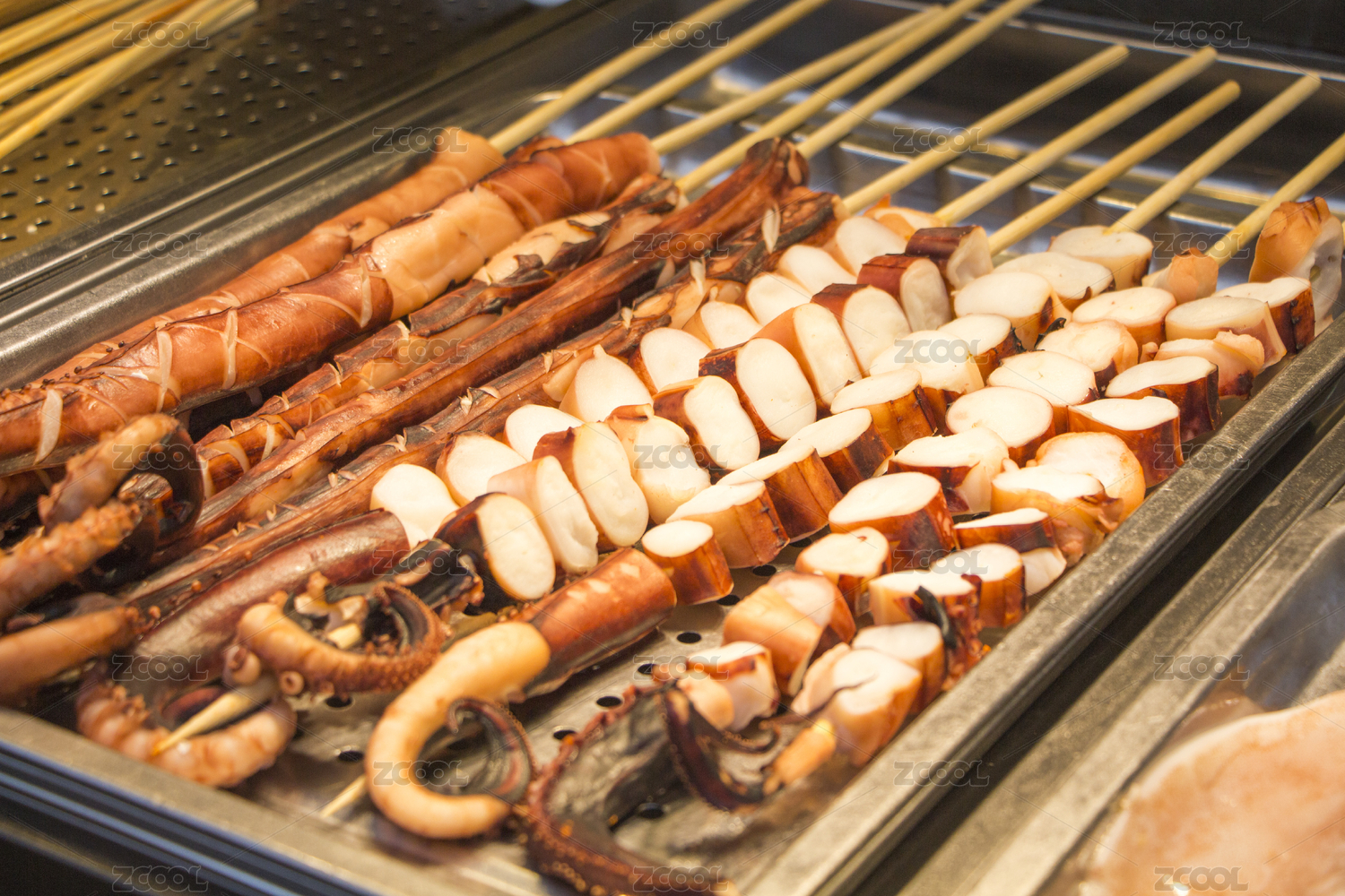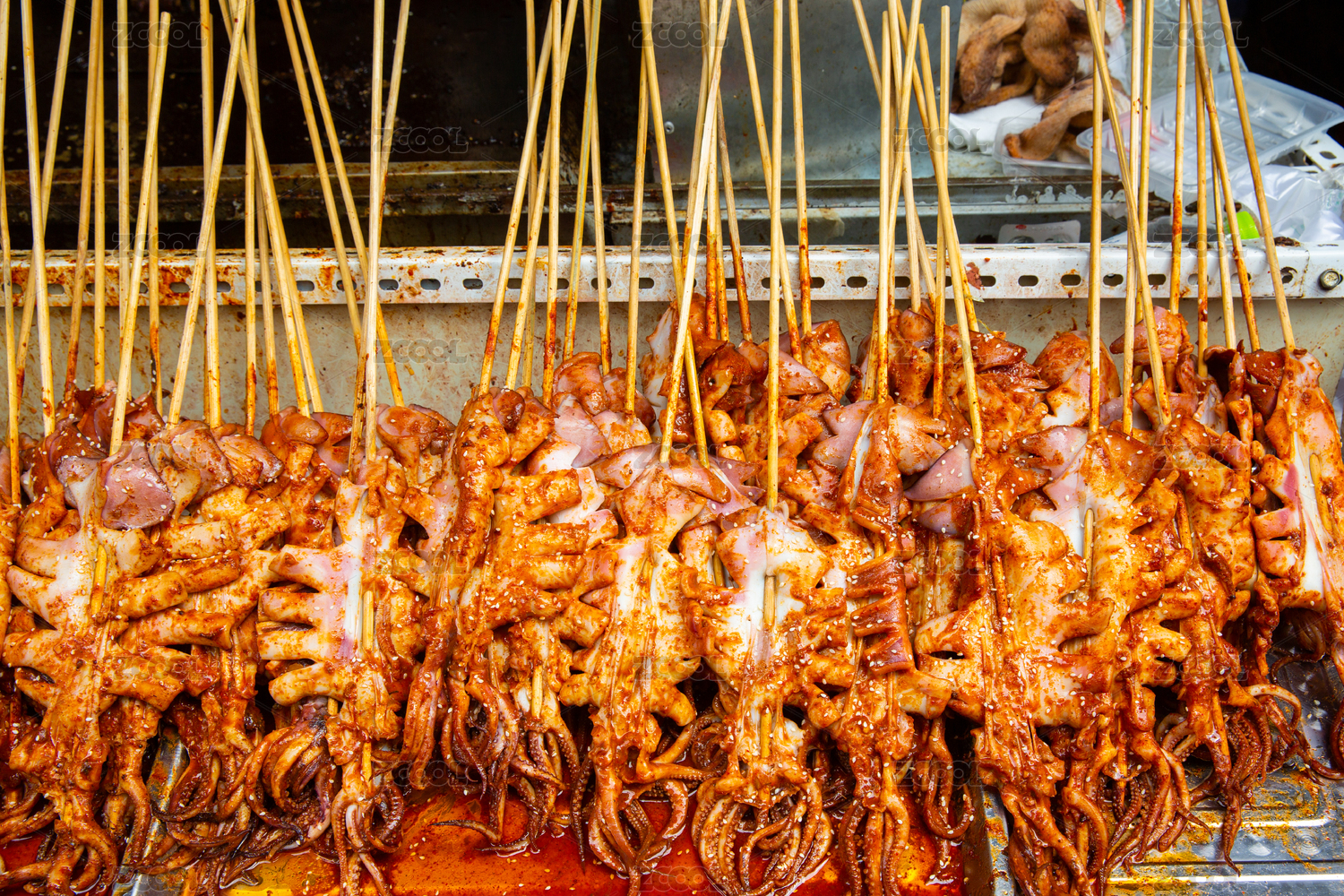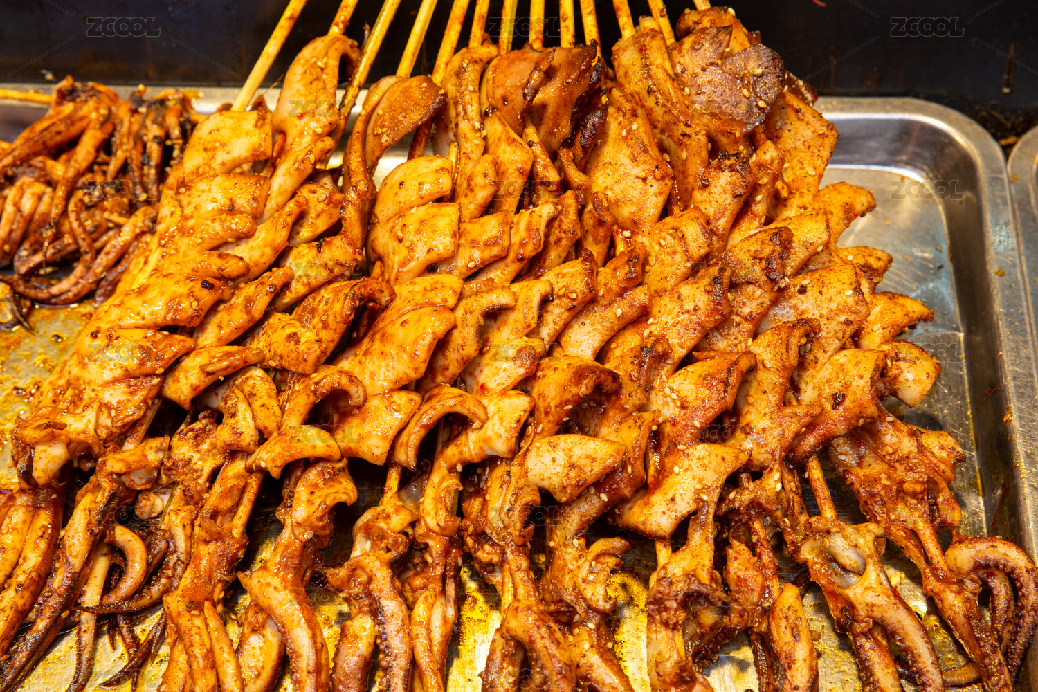 山東省青島市劈柴院美食街的烤魷魚串