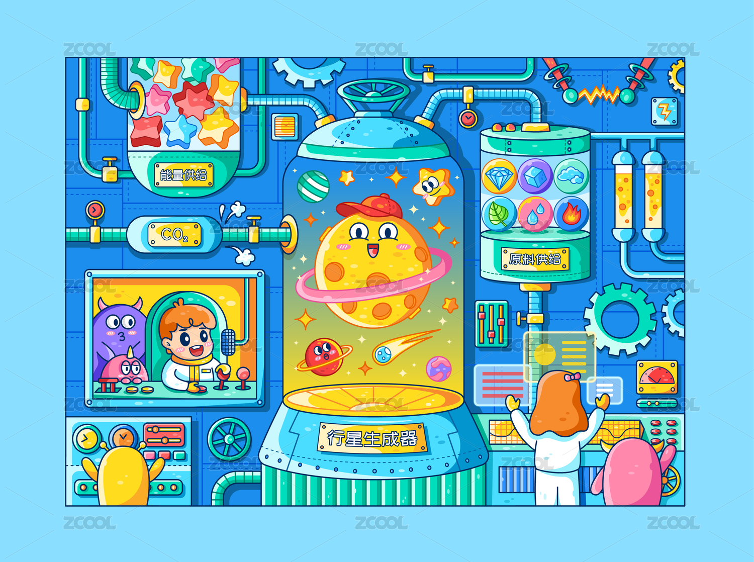 卡通兒童矢量插畫童趣實(shí)驗(yàn)室太空怪獸外星人