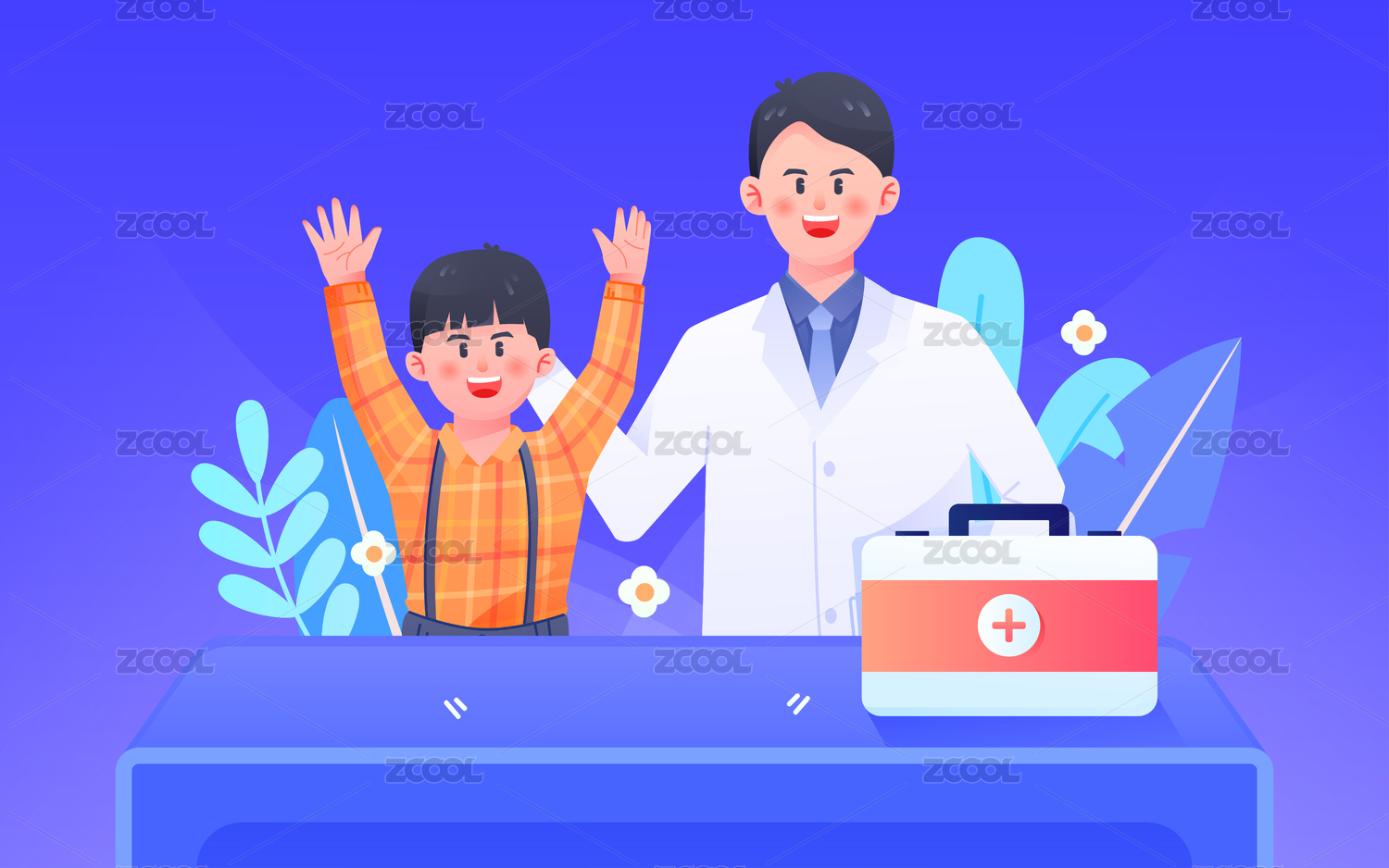 卡通醫(yī)生醫(yī)療兒童感冒發(fā)燒健康保險矢量插畫