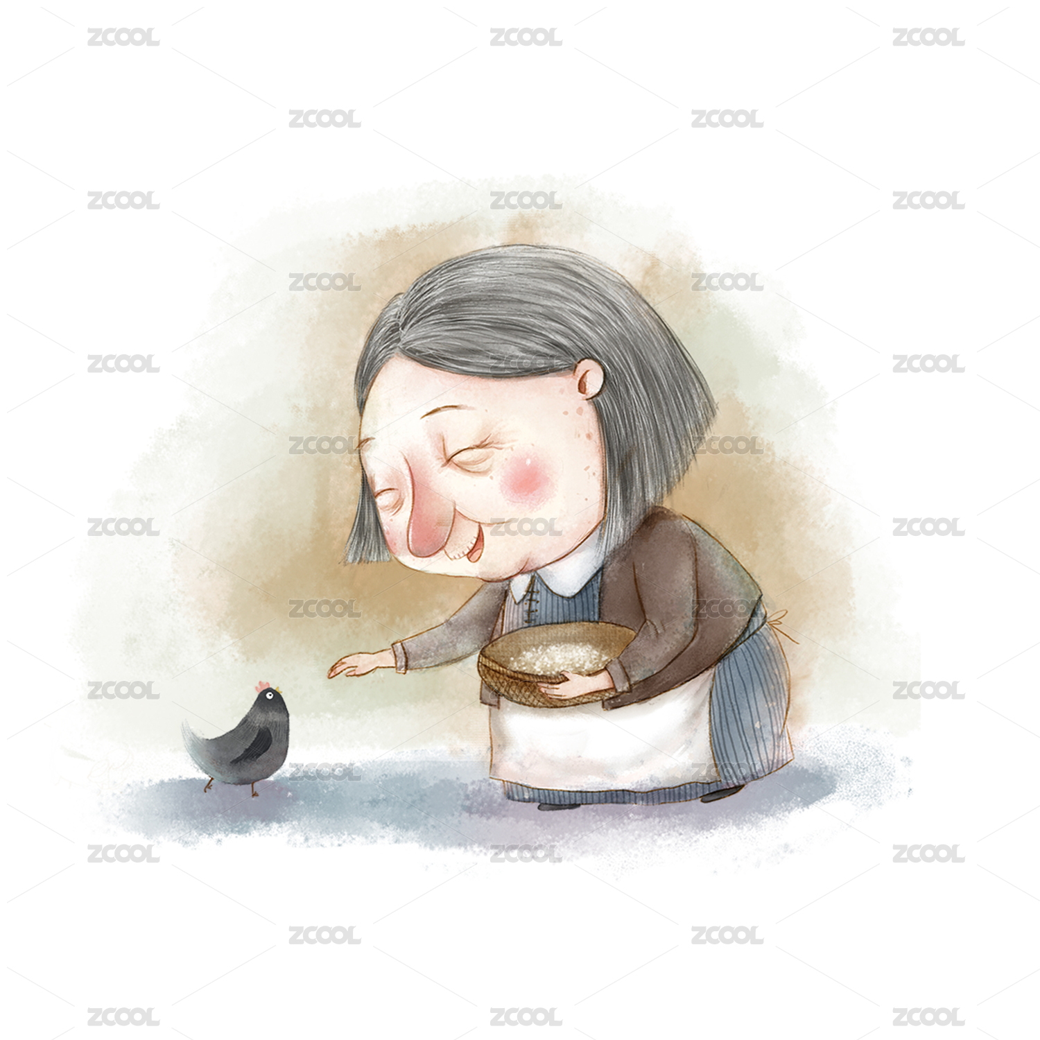 喂雞農(nóng)村奶奶水彩兒童教育插畫/Hand drawn sketch water color
