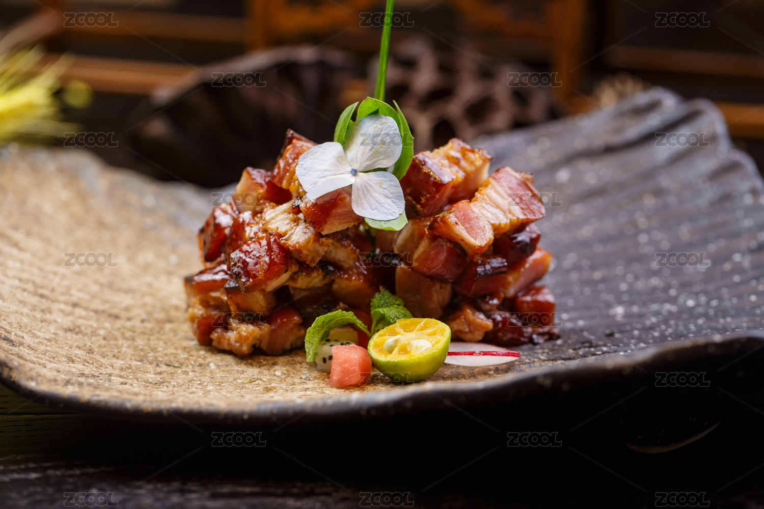裝飾有歐芹和鮮花的醬汁叉燒肉