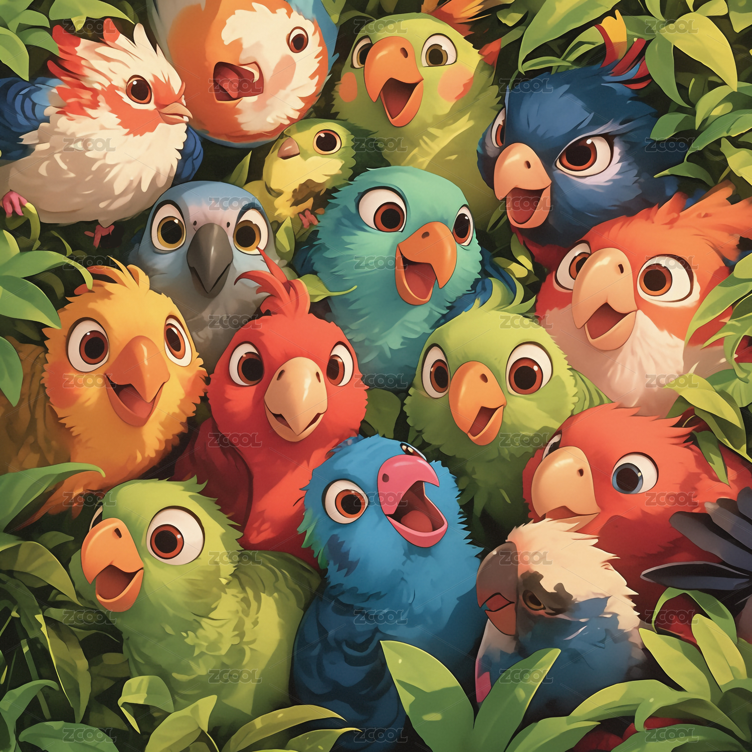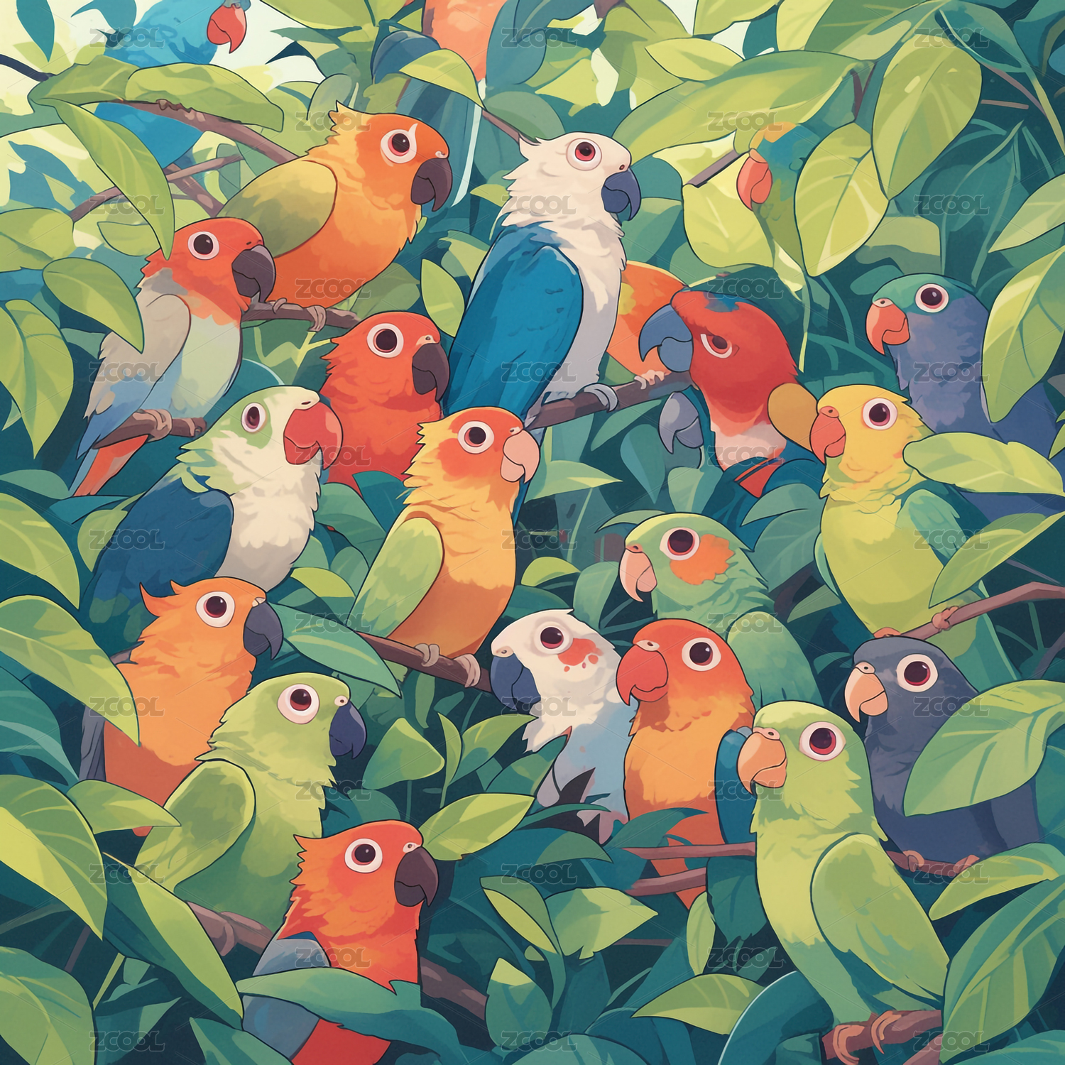 在熱帶叢林中群居的卡通鸚鵡群插畫壁紙