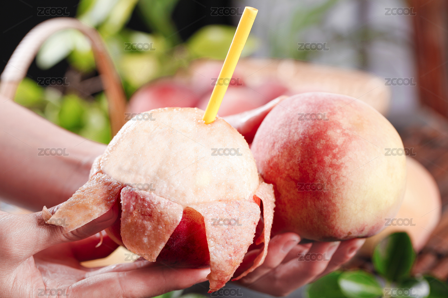 手上拿著一個叉著吸管的蜜桃