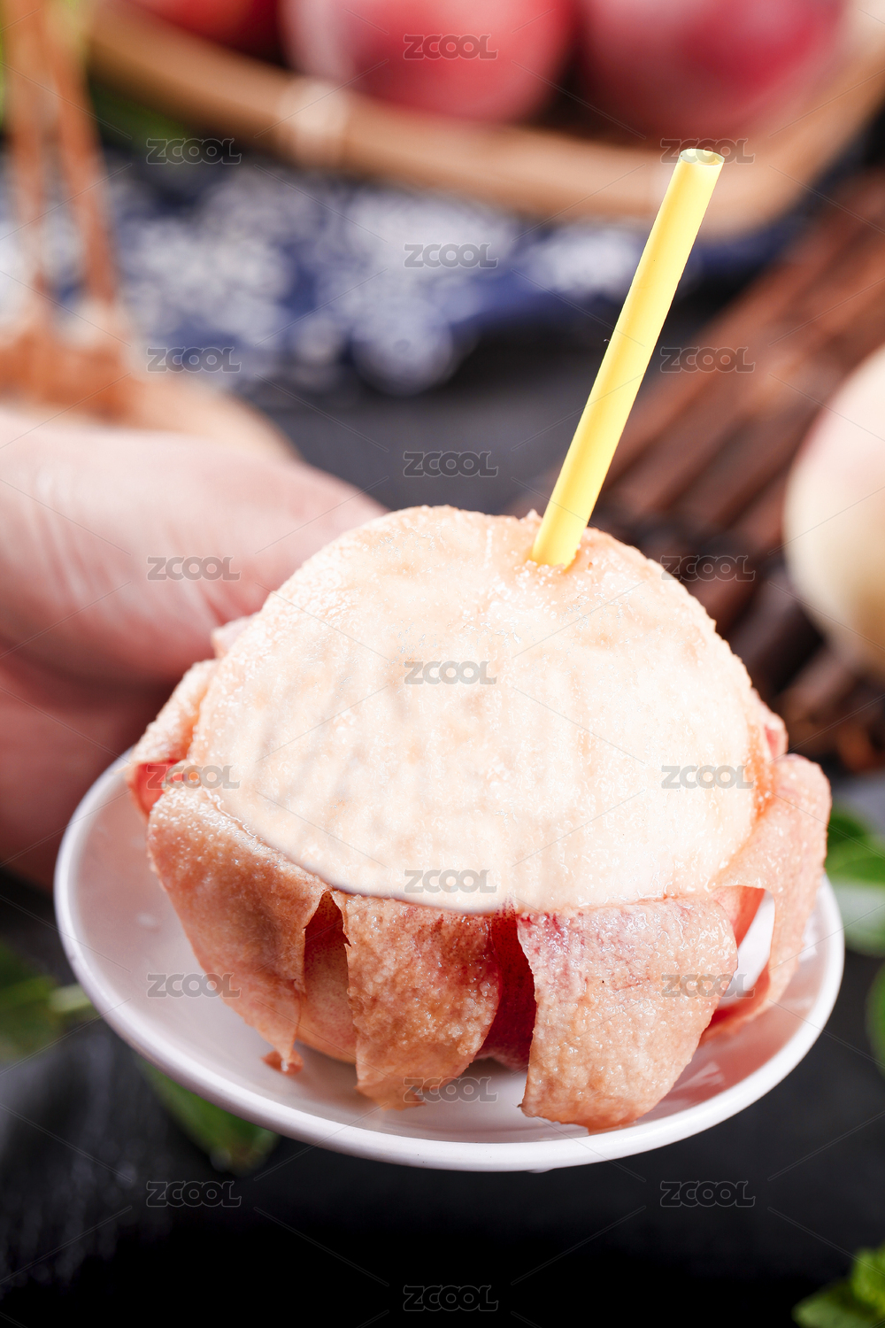 盤子里放著一個叉著吸管的蜜桃