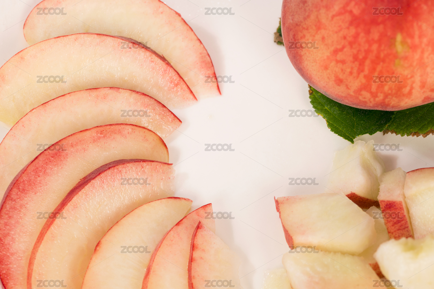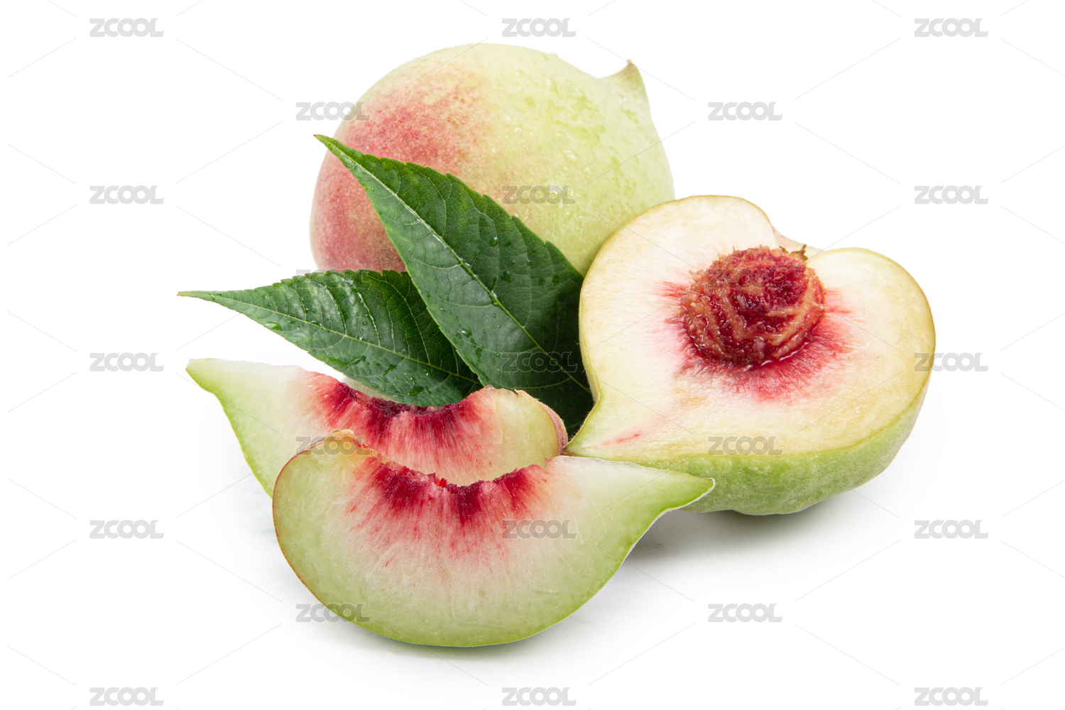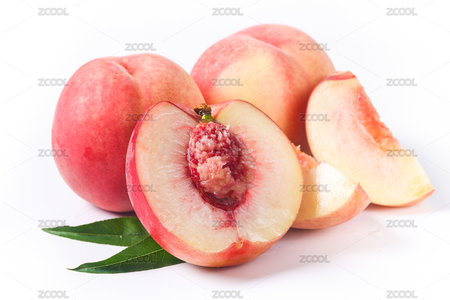 鷹嘴蜜桃和切開果肉帶綠葉子白底