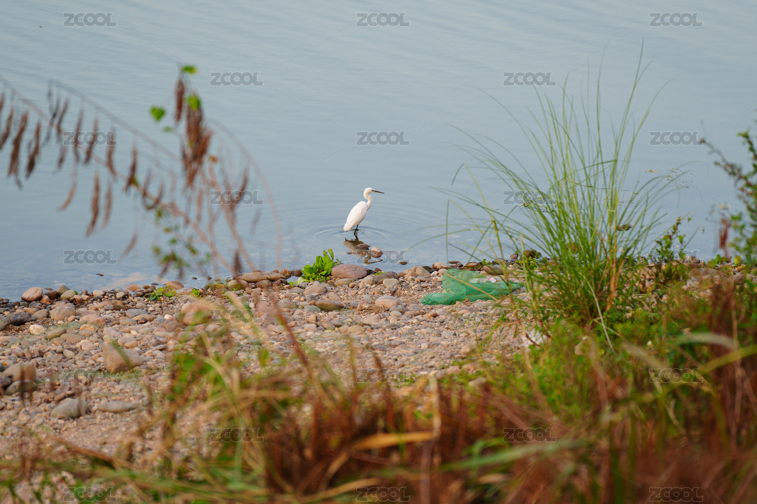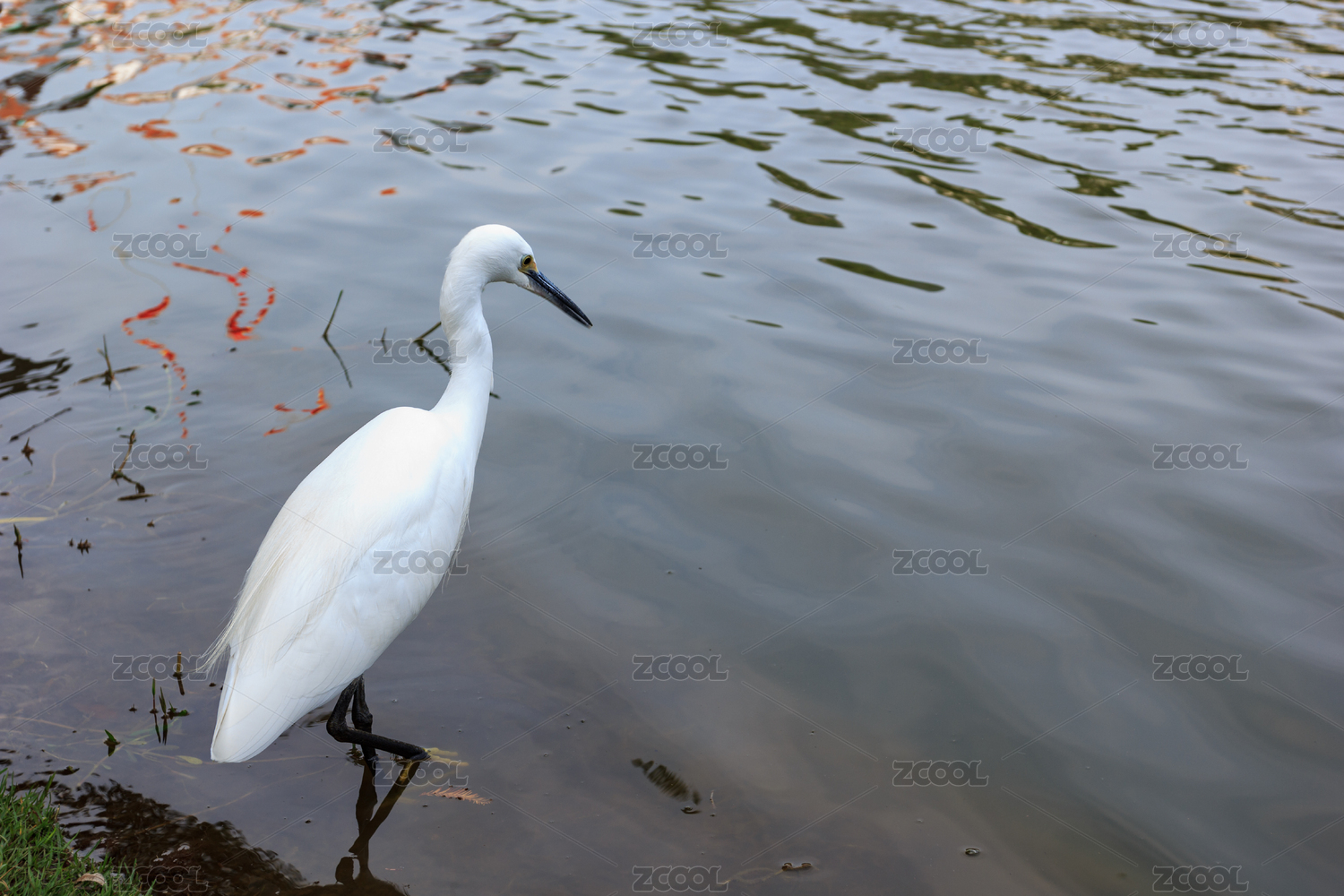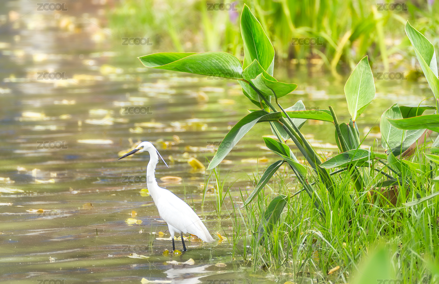 一只小白鷺鳥(niǎo)在開(kāi)闊的沼澤淺水灘里搜尋捕食