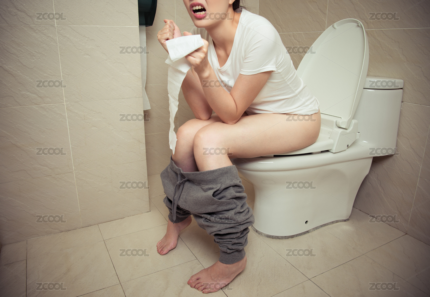 具有便秘的問題漂亮甜美的女人坐在衛(wèi)生間的馬桶座和保持衛(wèi)生紙與制造痛苦的情感特寫照片。