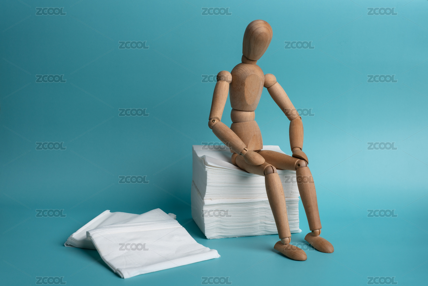 一個坐在一堆衛(wèi)生紙上的木偶