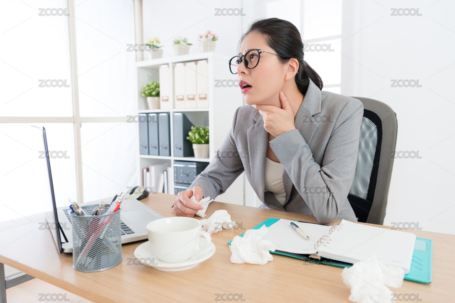 優(yōu)雅迷人的女業(yè)務(wù)經(jīng)理在辦公室工作的感覺喉嚨疼痛,當(dāng)她得到流感疾病問題。