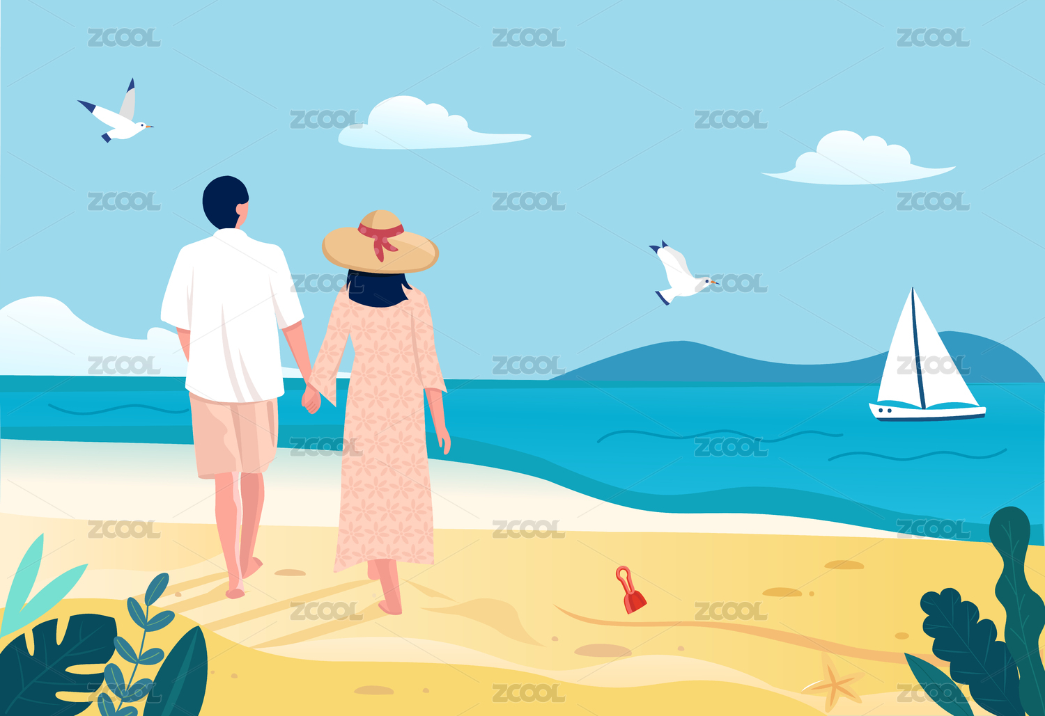 夏天情侶牽手海灘散步插畫