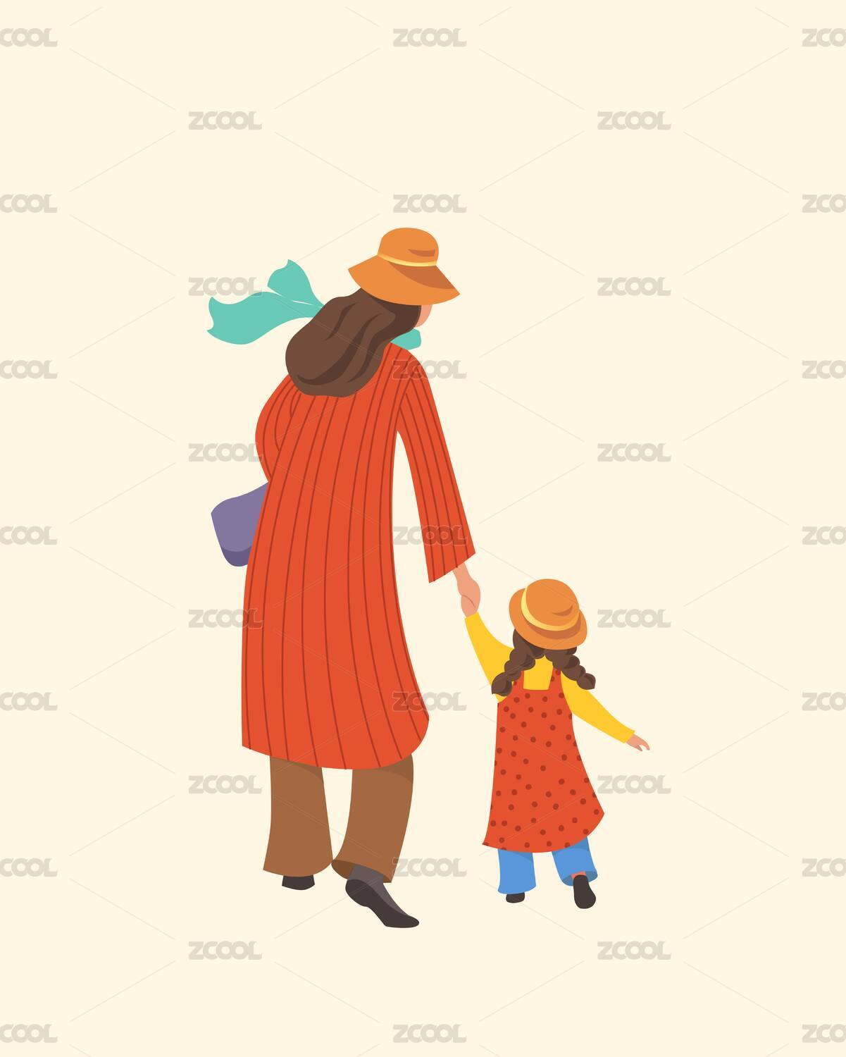 矢量母女幸福牽手人物親子插畫