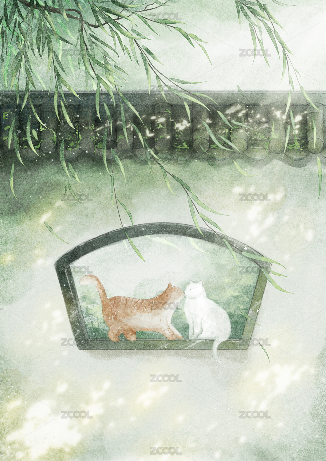 滿園春色關(guān)不住 春天庭院柳樹下的貓