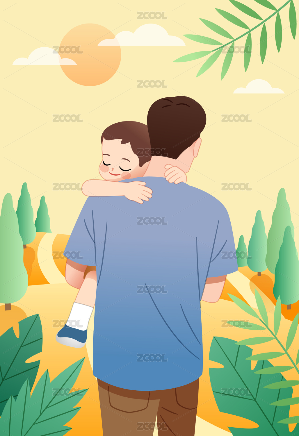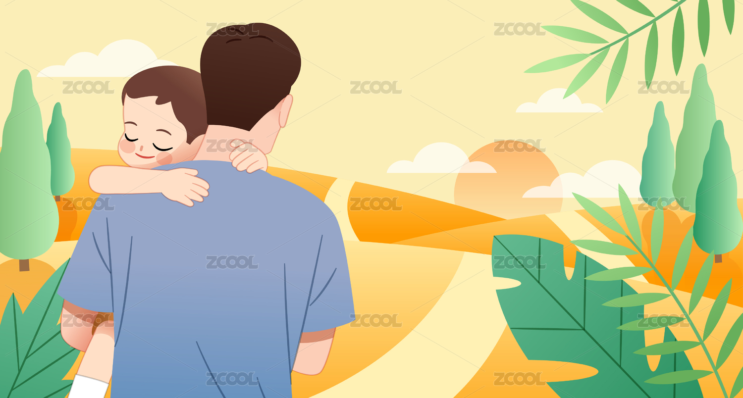 一個(gè)父親抱著孩子走在戶外的路上