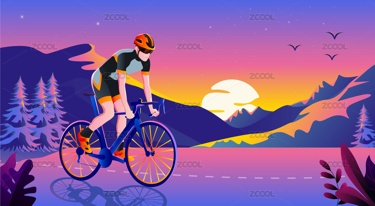 一個(gè)在傍晚山路上騎自行車(chē)的男青年