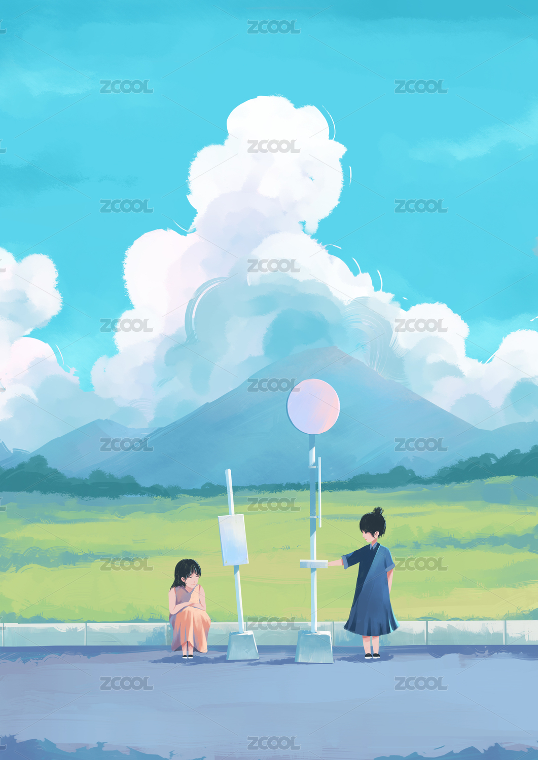 夏天公路上的小女孩