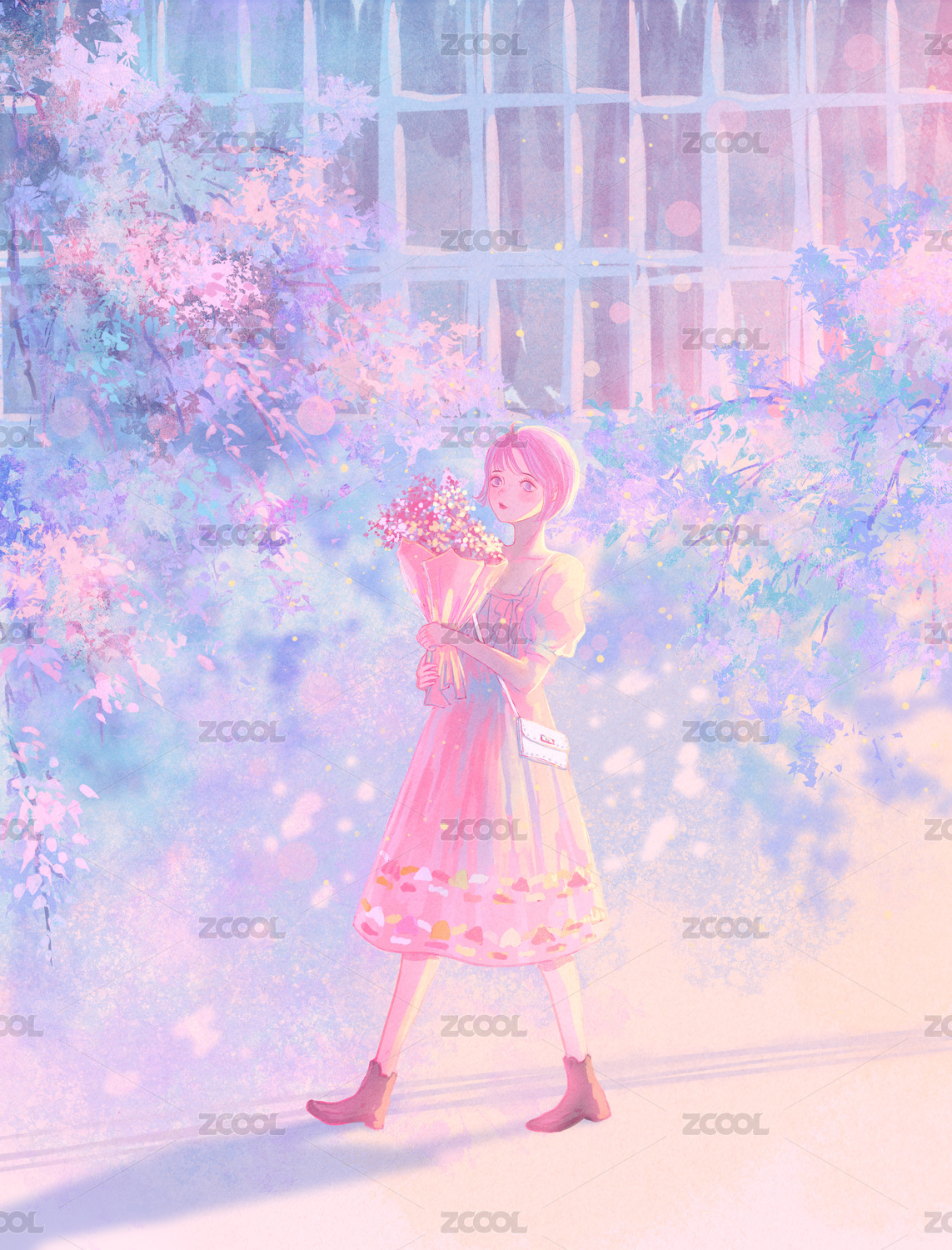 少女抱著一束滿天星走在黃昏的路上