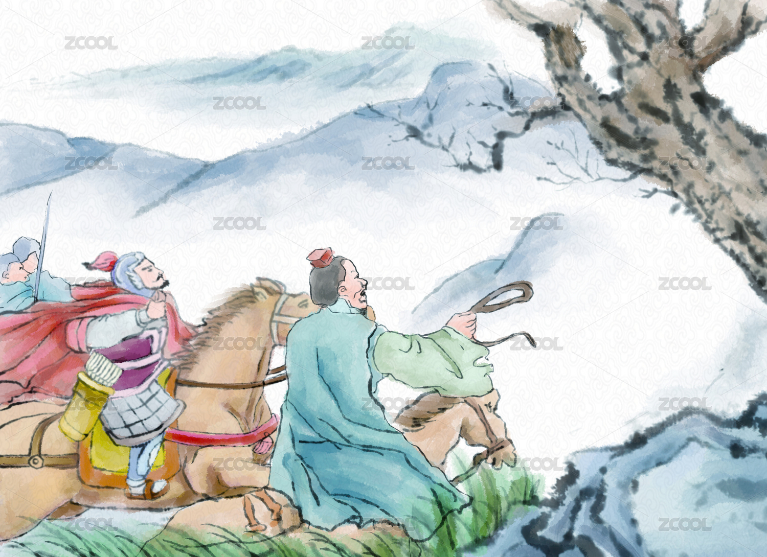 古代水墨騎馬外出郊外路上