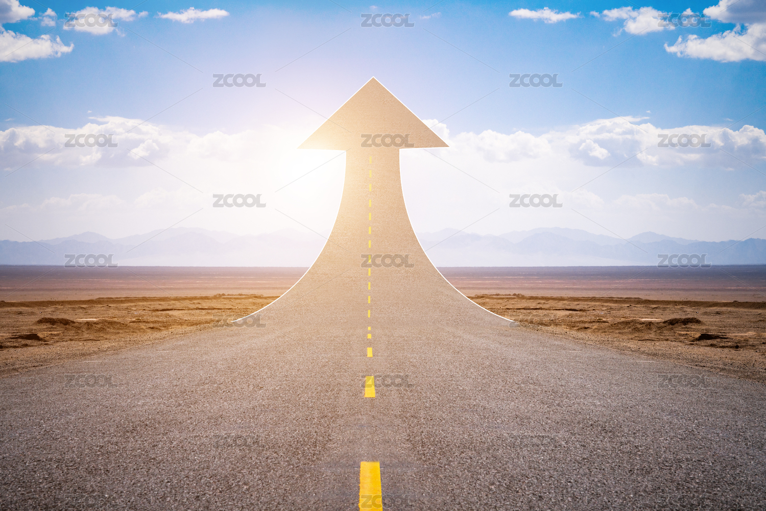 無(wú)人空曠的中國(guó)青海道路高速公路上向上增長(zhǎng)的箭頭公路代表漲幅概念