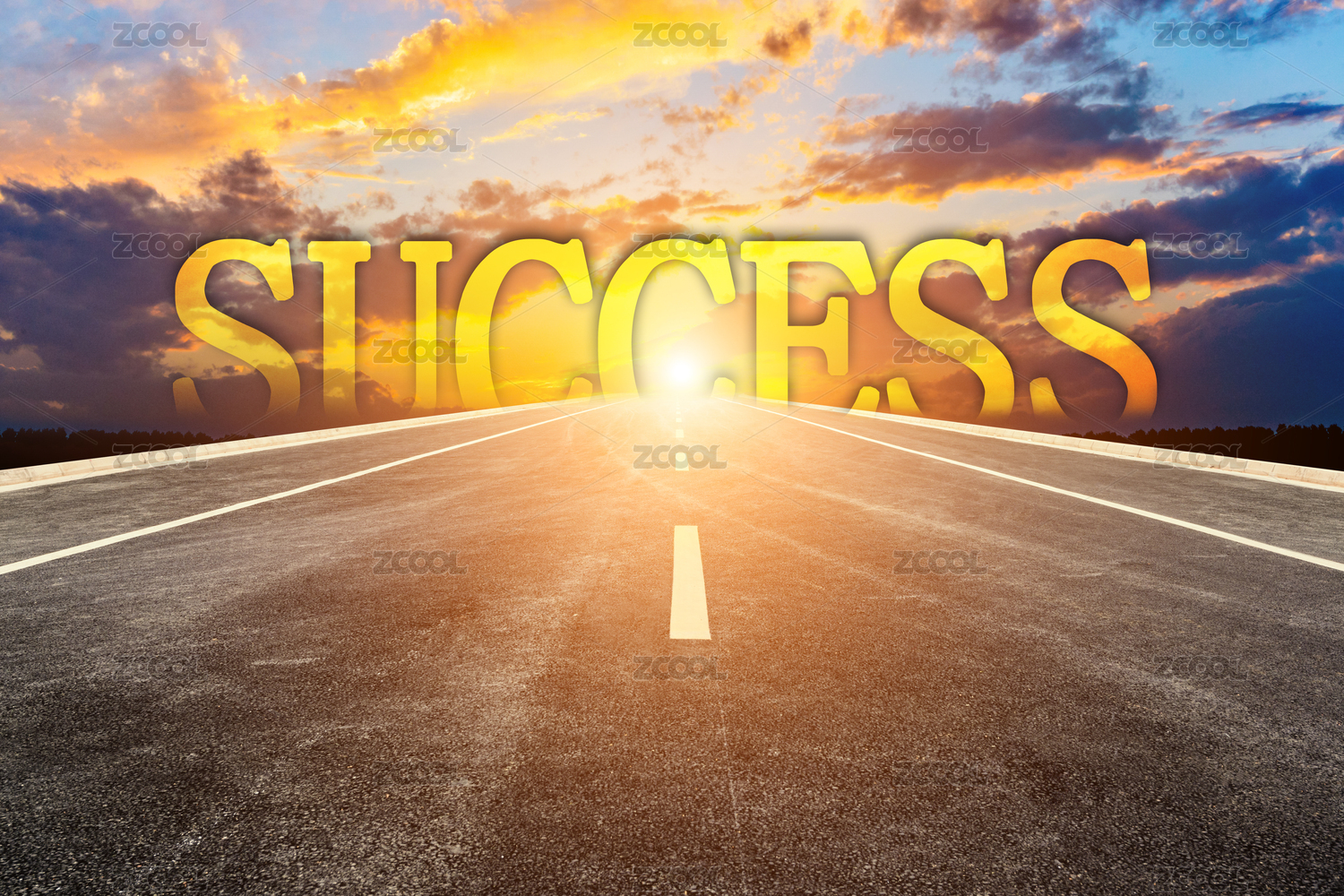 把“成功”寫(xiě)在筆直向前空曠無(wú)人的瀝青道路上。關(guān)于成功概念創(chuàng)意圖。