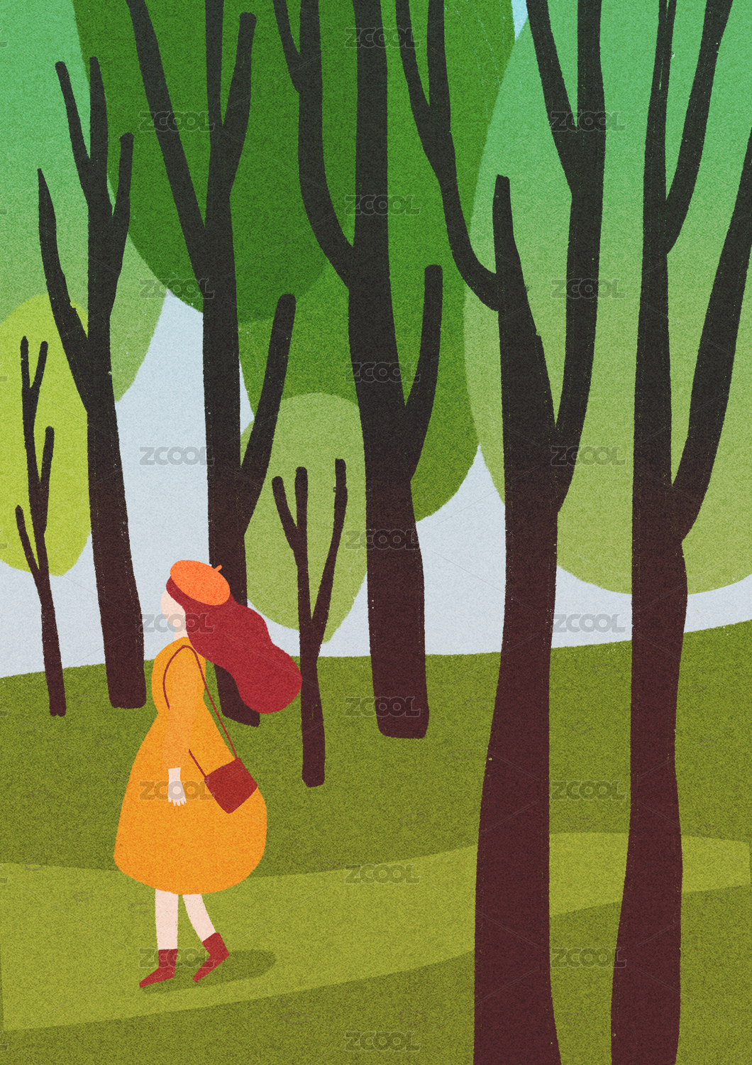 穿黃色裙子的女人在樹(shù)林的小路上散步