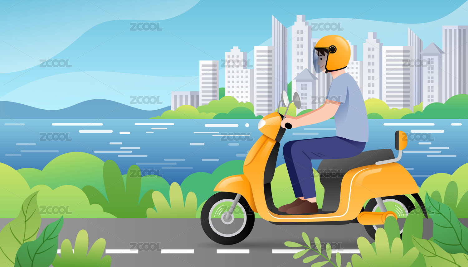 一個(gè)男生騎摩托車(chē)行駛在城市道路上