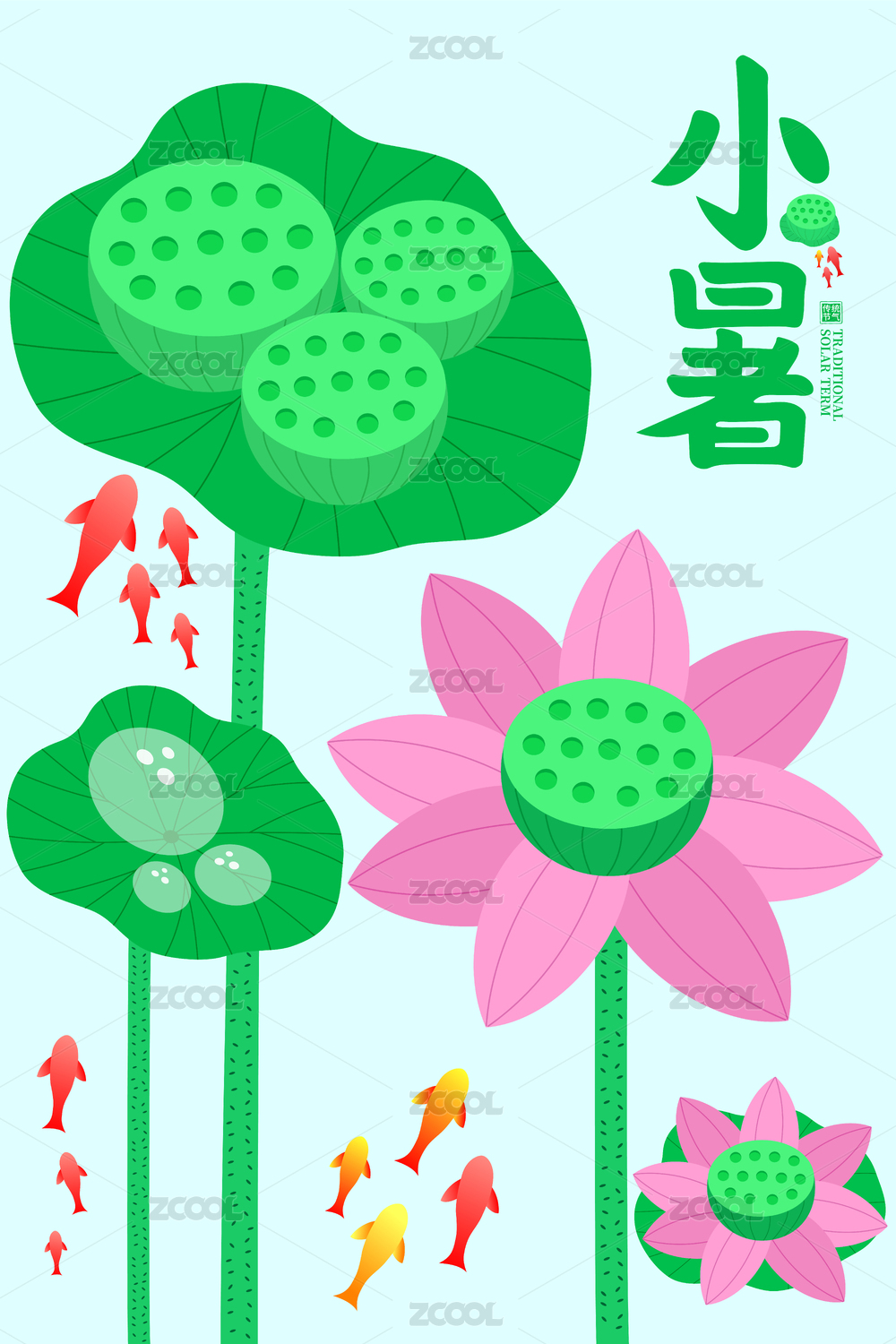 清新荷花蓮蓬錦鯉小暑海報