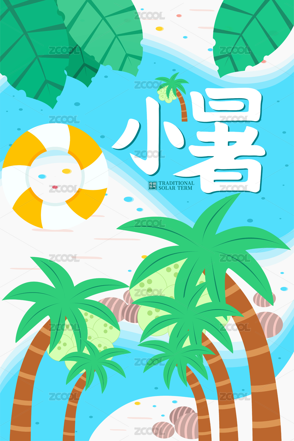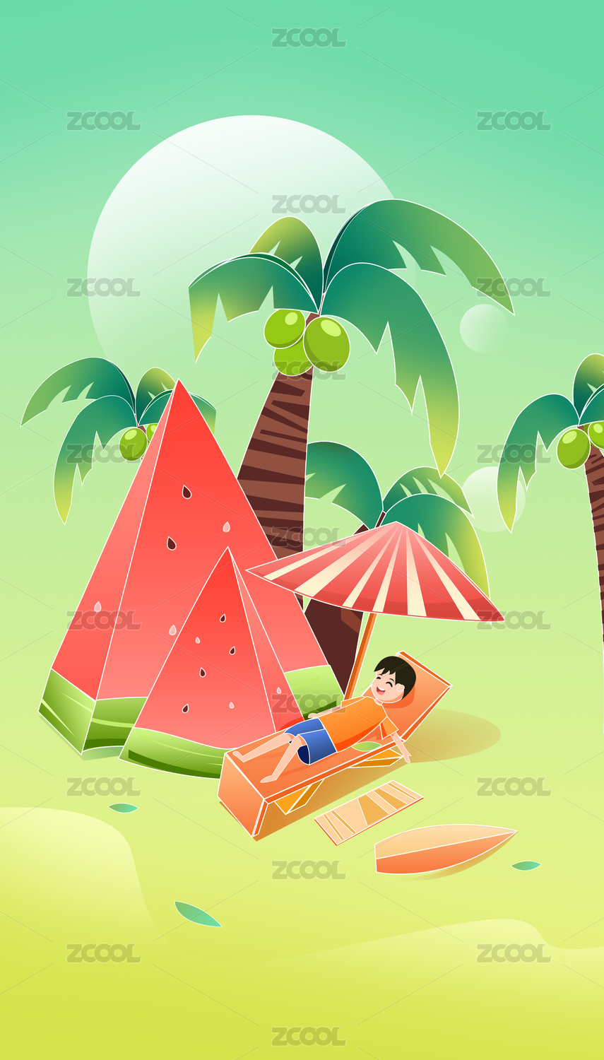 清涼夏日小暑大暑夏至海邊度假吃瓜插畫海報