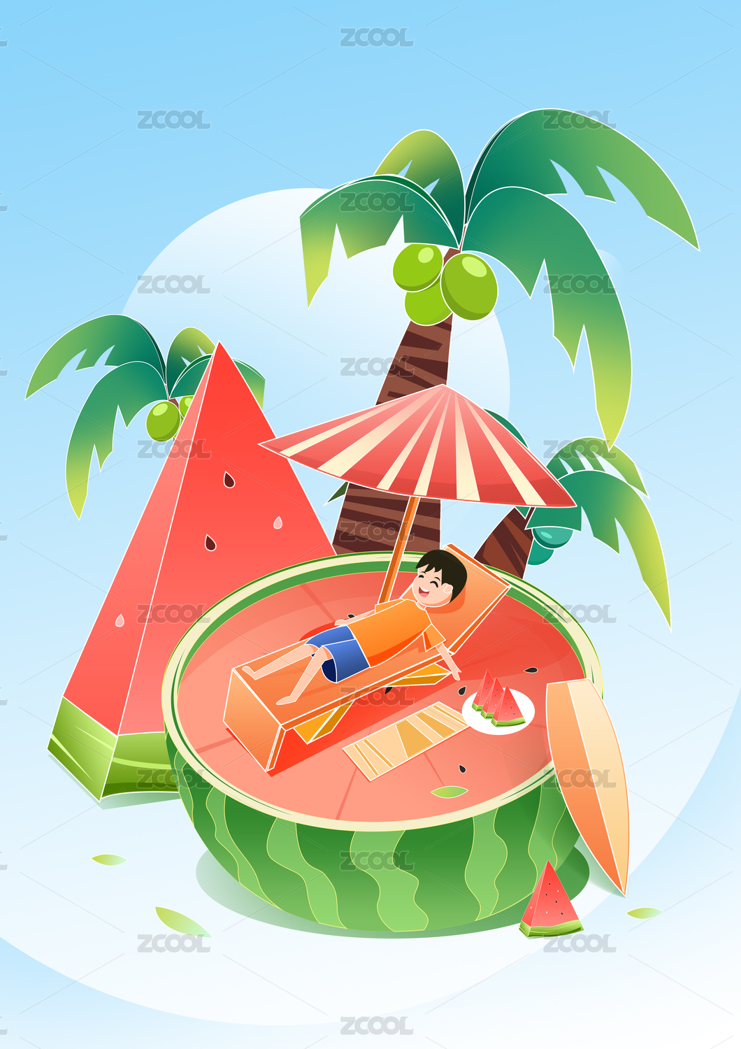 夏天大海沖浪清涼西瓜矢量插畫